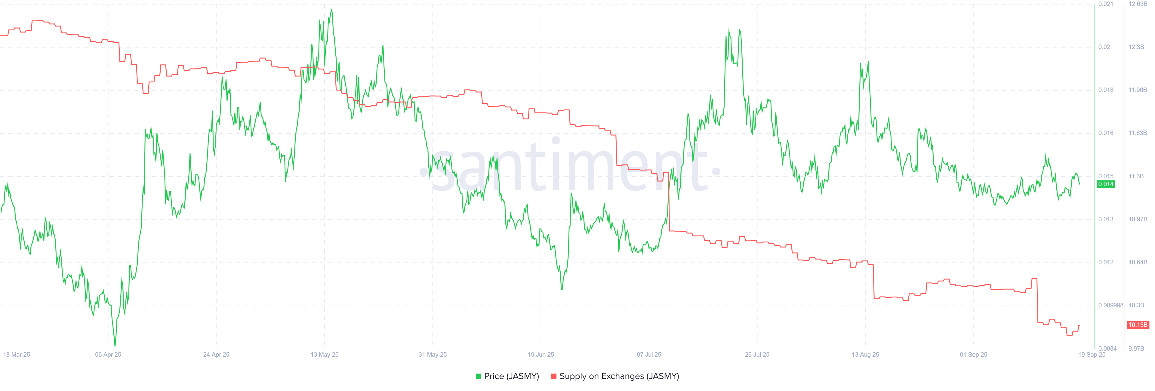 Santiment data also reveals that JASMY’s exchange reserves hit a one-year low of 10.1 billion in September. Charts highlight a persistent downtrend in reserves that lasted for a year.