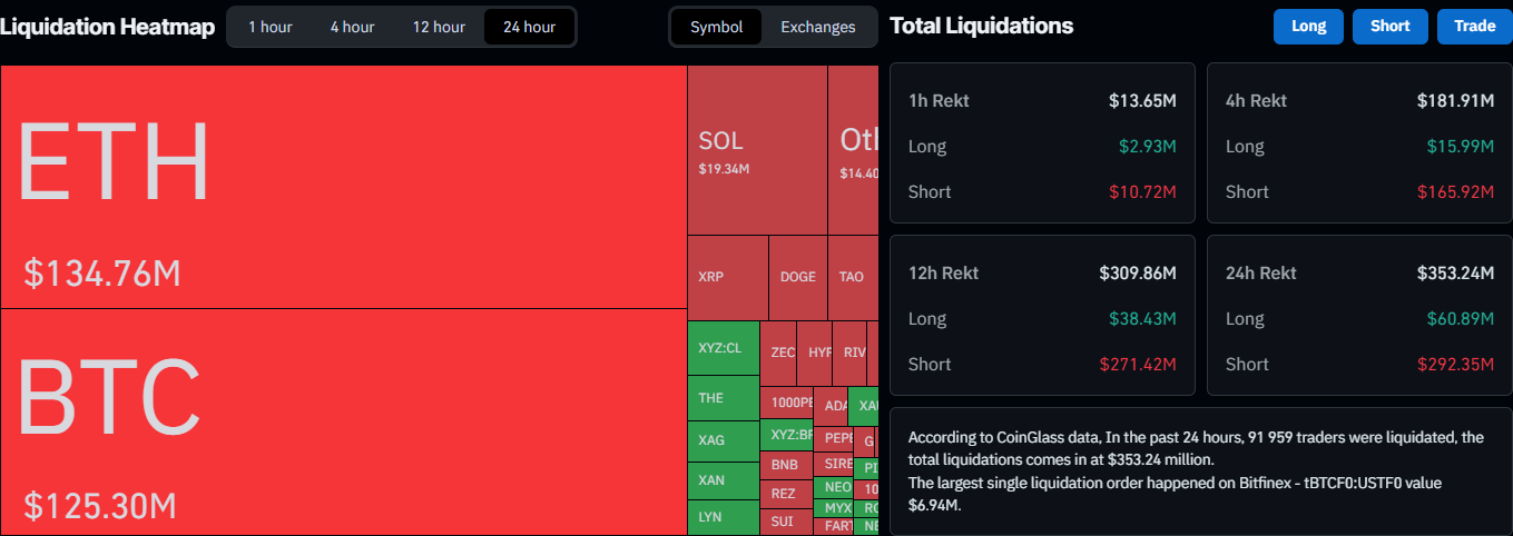 Notable gains are evident from ADA (10%), DOT (12%), PEPE (15%), ETC (9%), and others. The total value of wrecked positions has risen to $350 million, according to CoinGlass, with nearly $300 million coming from shorts. Interestingly, ETH shorts are responsible for the largest portion, followed closely by BTC’s.