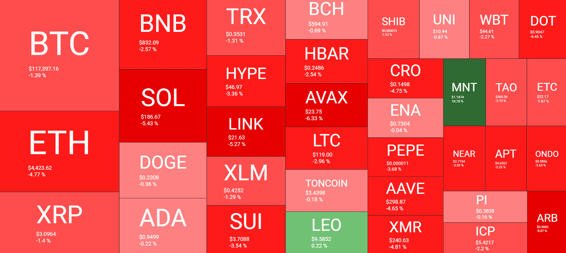 The rest of the larger-cap alts are in the red as well, with SOL, LINK, AVAX, SUI, and HYPE dropping by 3-7%. MNT is the only notable exception. The asset has surged by over 10% and trades at $1.2, while the rest of the alts are in the red.