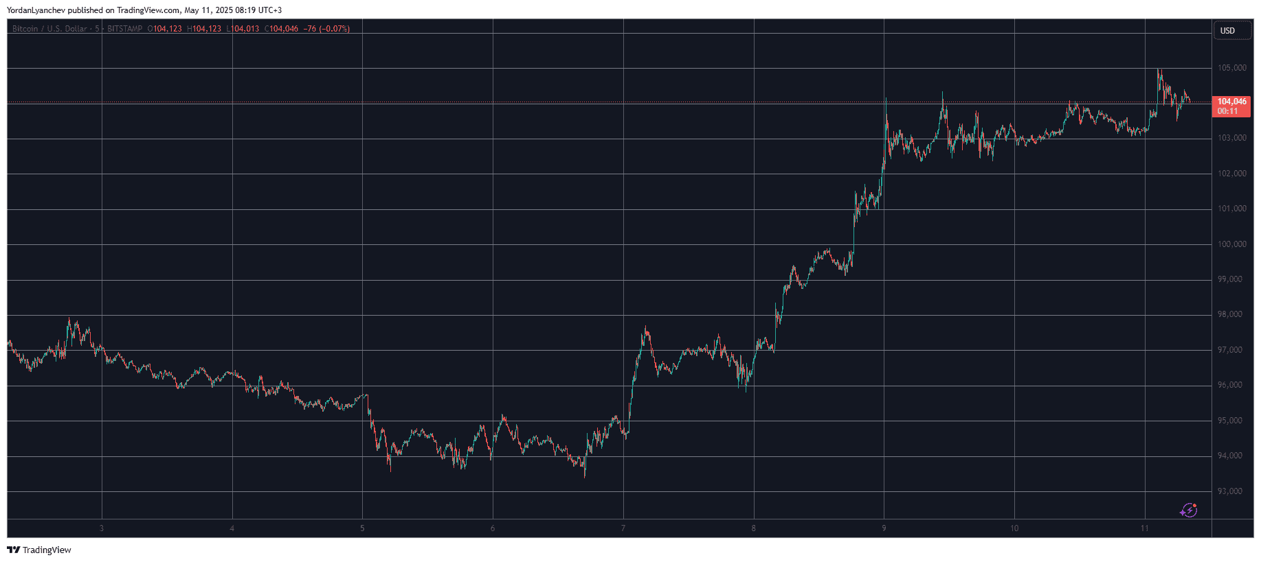 Although BTC is still in the green on a daily scale, its increase is a lot more modest. BTC has jumped by less than 1% and trades above $104,000 after it was stopped at $105,000 earlier.