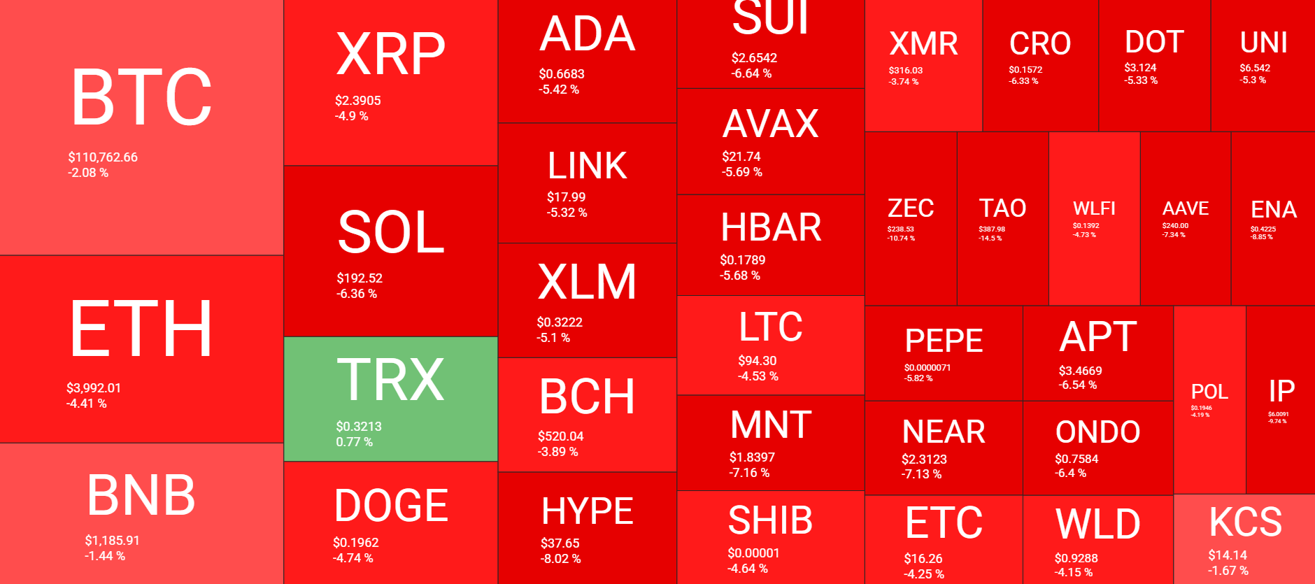 Most altcoins have produced even more painful declines over the past 24 hours. Ethereum leads the pack with a 4.4% drop that has pushed it to under $4,000. XRP has dipped to $2.39 after a 5% nosedive. SOL, ADA, LINK, DOGE, XLM, HYPE, SUI, AVAX, HBAR, and MNT have charted losses of up to 8%.