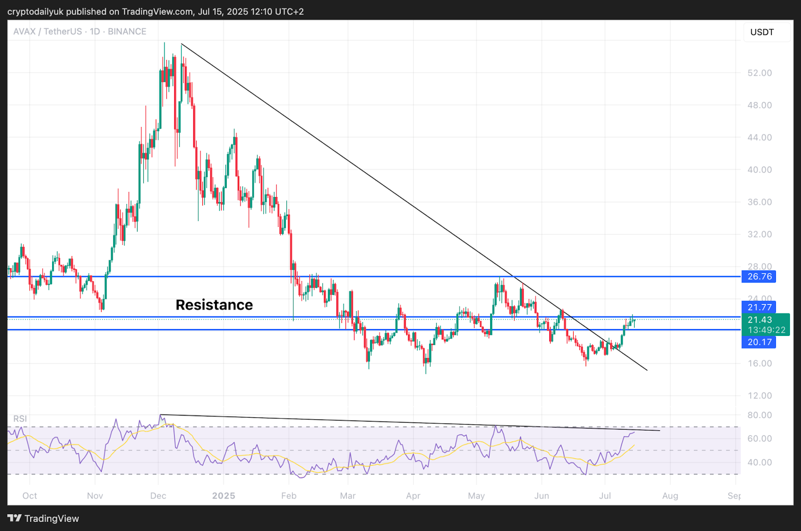 The daily chart for the $AVAX price reveals a breakout of the descending trendline. The price has increased as much as 24% since this breakout and is currently battling with the upper band of resistance at $21.77. If this can be broken, and confirmed above, the local high at $26.76 is the obvious target. Getting above this level, and also breaking the descending trend on the RSI, could spark a decent revival for $AVAX going into the rest of the bull market.