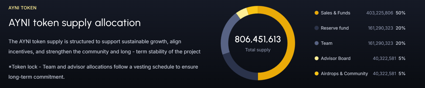 According to the AYNI tokenomics, the token has a fixed supply of around 806 million AYNI.