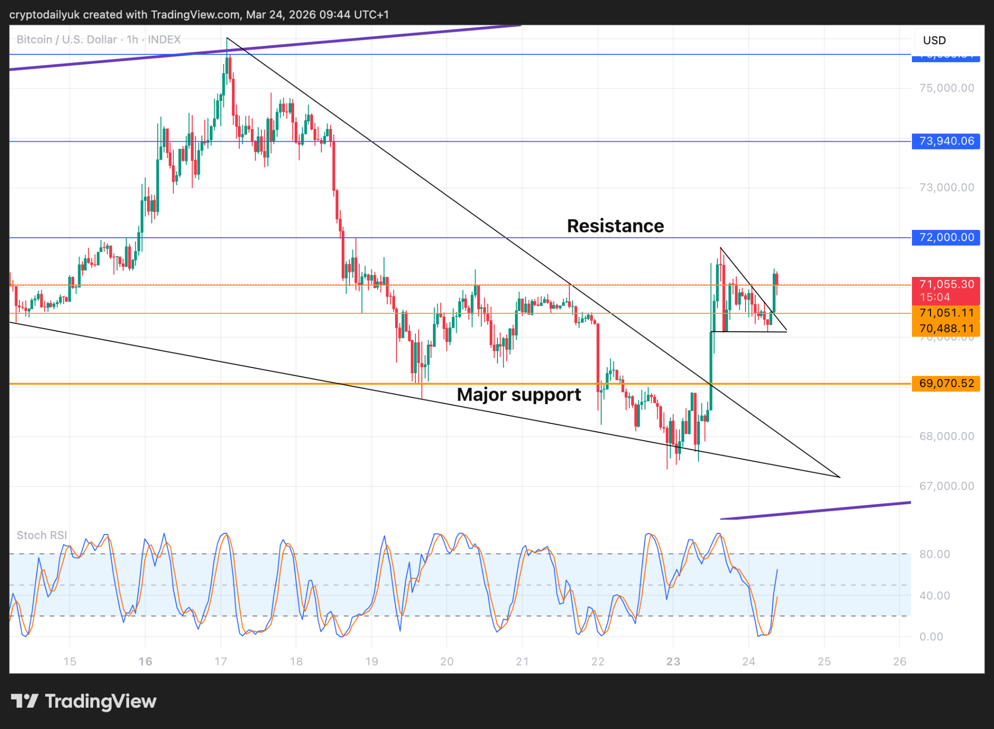 The $72,000 horizontal resistance level is the full extent of the measured move out of the triangle, so this is the first barrier to more upside, and quite a critical one at that. $73K and then $74K need to follow, before a new higher high above $76K.