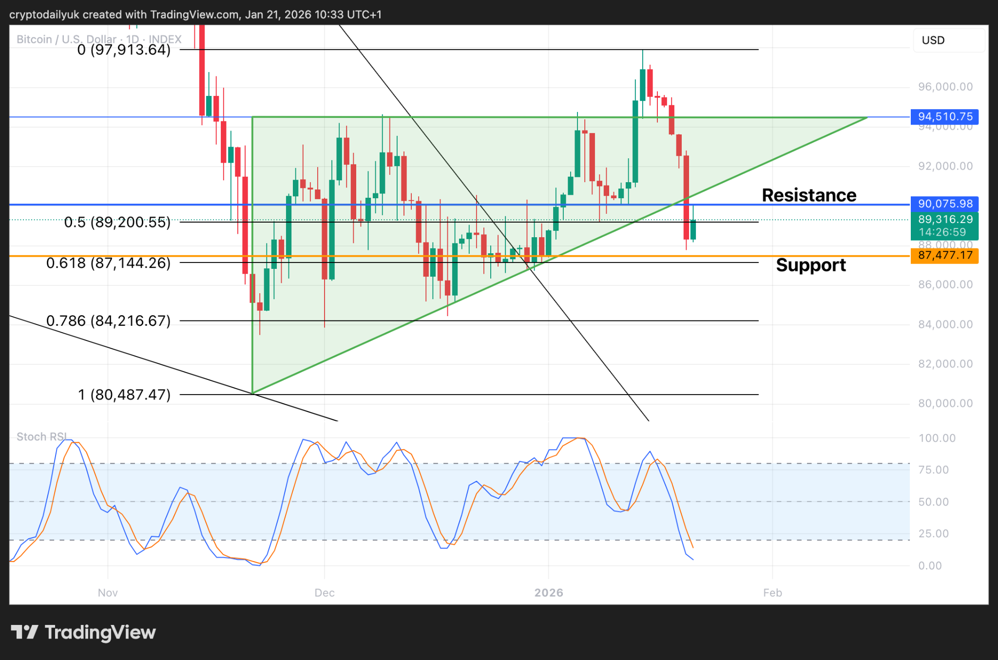The weekly time frame chart shows that the major trendline runs through the middle of the 0.5 Fibonacci and the $90,000 level. Because this is such a big time frame there is the chance that the $BTC price will close the week back above that $90,000 level, thereby keeping it as support.