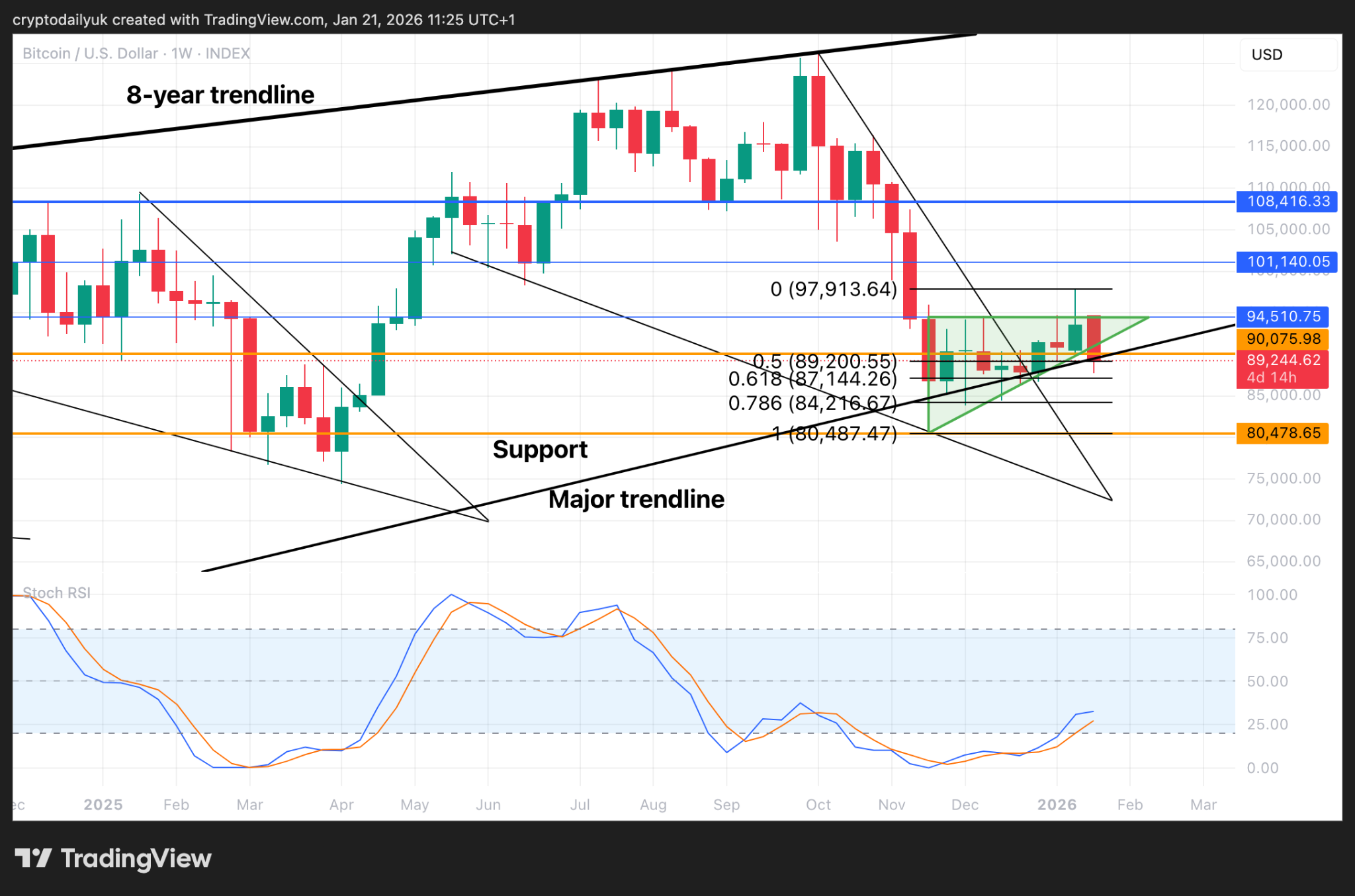 On the other hand, if the price takes hold below the major trendline it could then head down to the $80,000 horizontal support. This would be the last line in the sand before a drop to $74,000/$69,000, which was the last bull market top.