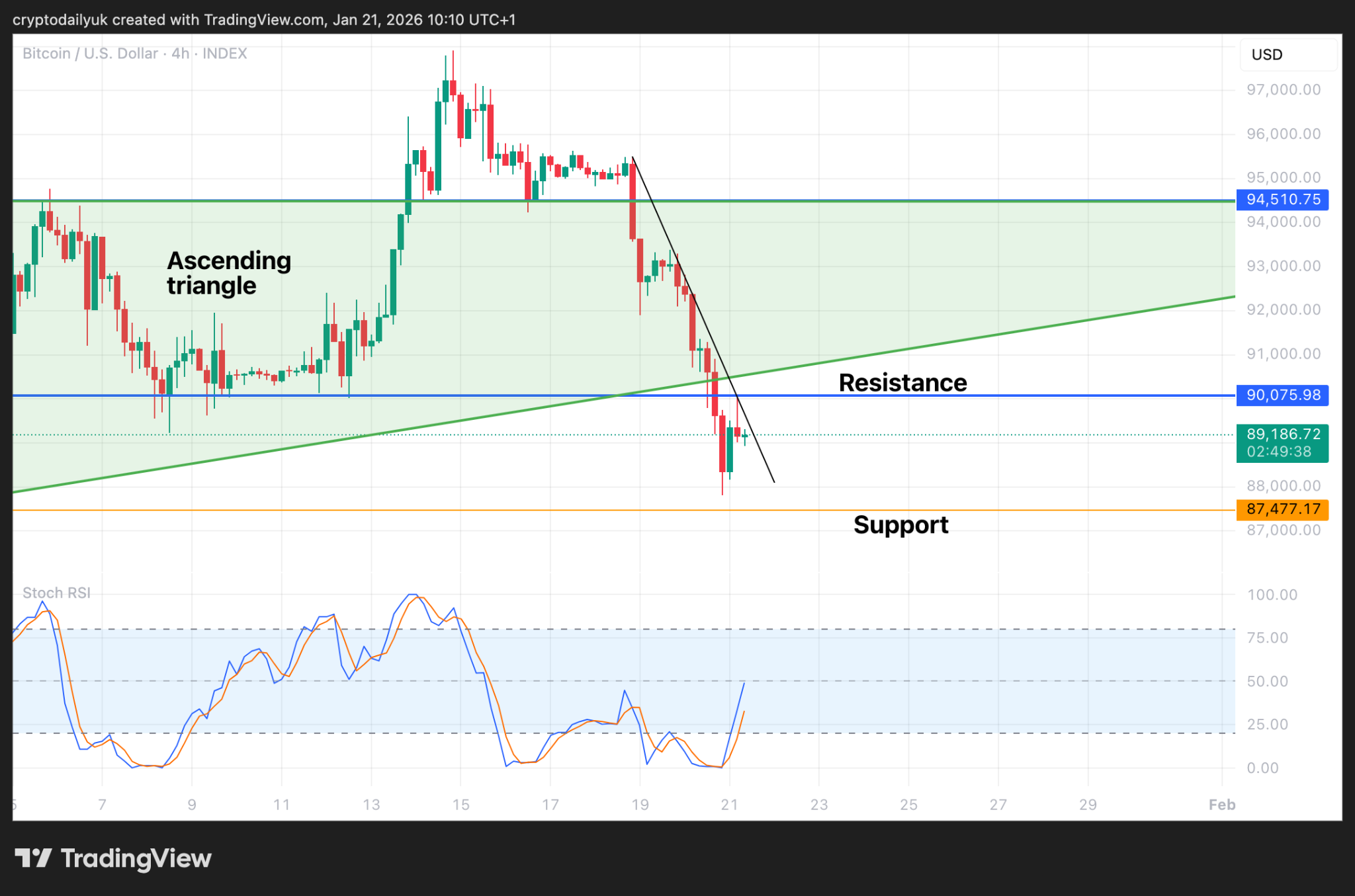 First glance at the short-term chart for the $BTC price does not instil confidence. Not only has the price fallen down through the bottom of the ascending triangle, but it has lost the crucial $90,000 horizontal support. This has now been turned into resistance with a quick candle wick back to this level as confirmation.