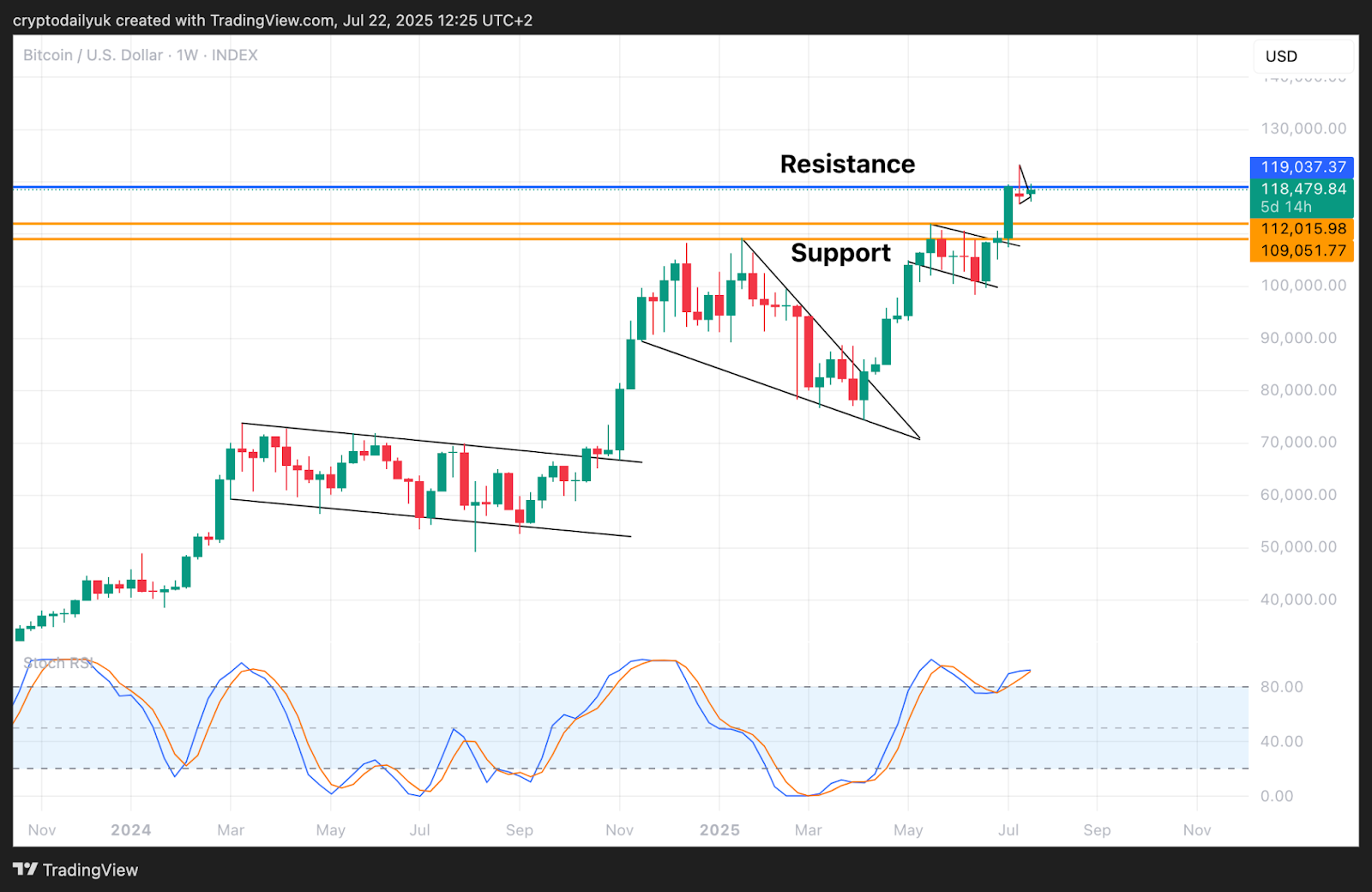 Bitcoin (BTC) has been hovering above and below $118,000 for more than a week now. The price is also traversing inside a triangle, and is coming near to a breakout point. Could there be a surge to $130,000 and beyond, or are we in for a dip, followed by more sideways choppiness?