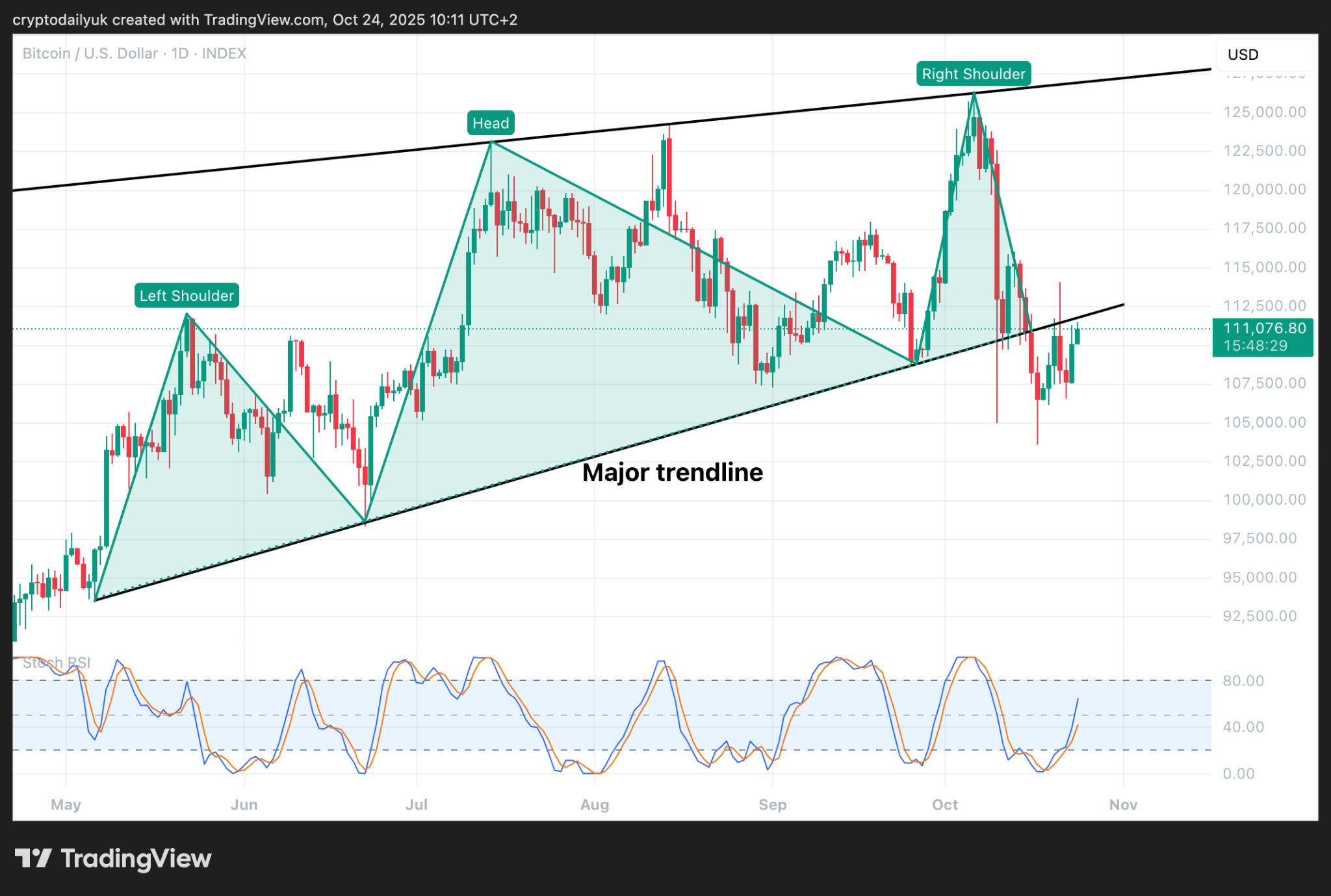 Moving out into the daily time frame, the spectre of a head and shoulders pattern is still hanging over the hopes of a continuation of this Bitcoin bull market.