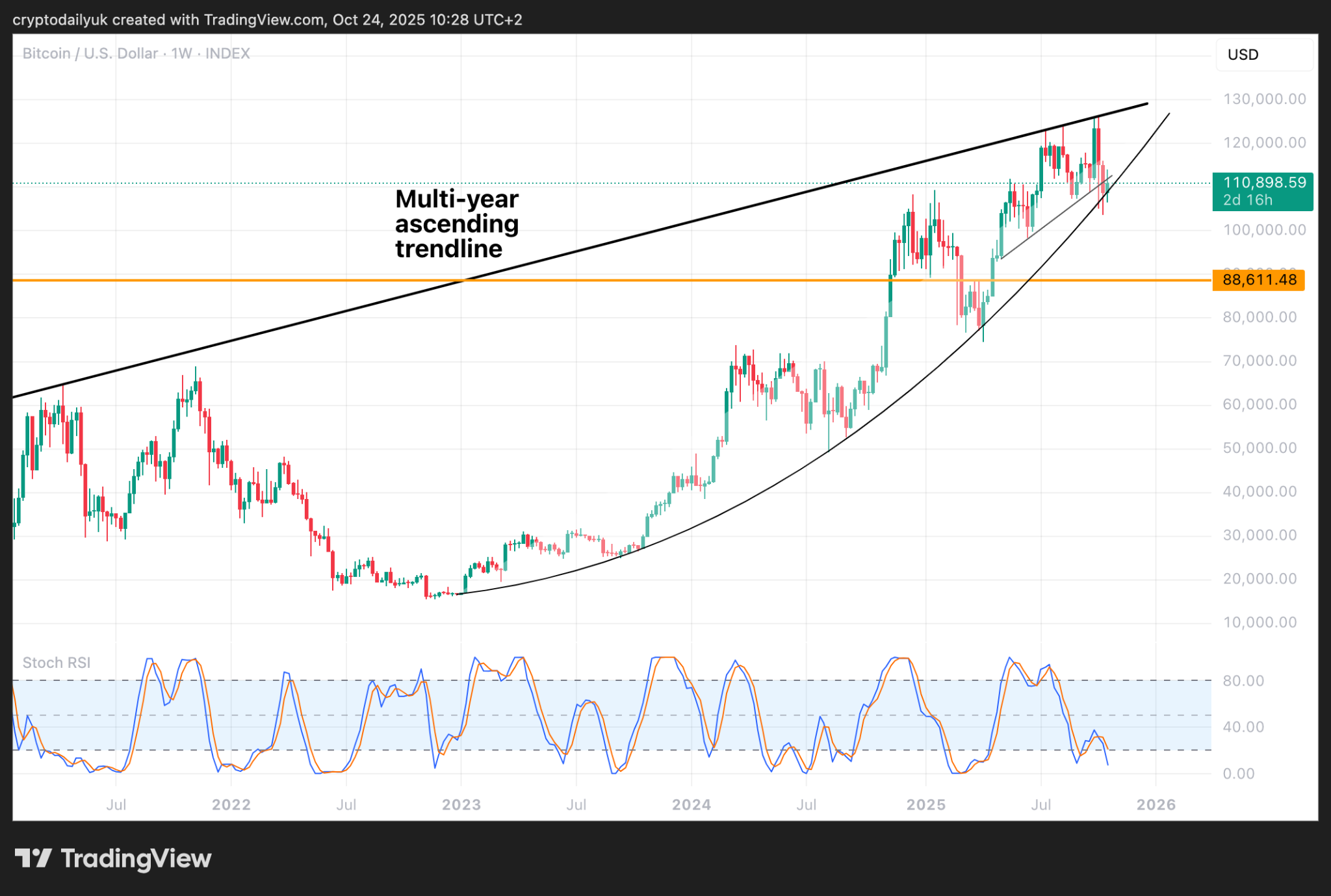 So here we are once again resting against the parabola that has contained the $BTC price over the entire length of the bull market up to now. If the head and shoulders plays out, this will obviously send the price down through the parabola to the extent of the measured move, which would take it down to the horizontal support line at $88,000 (orange line).