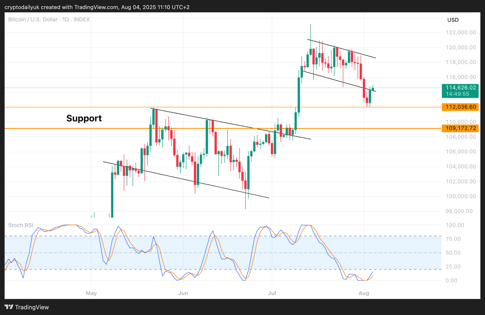 Bitcoin (BTC) sank all the way down to touch horizontal support at $112,000 over the weekend. This was perhaps due to the negative market reaction to US tariff increases together with a very gloomy jobs data release and previous downward revisions. Is the worst now priced in? Can Bitcoin continue to rally from here?