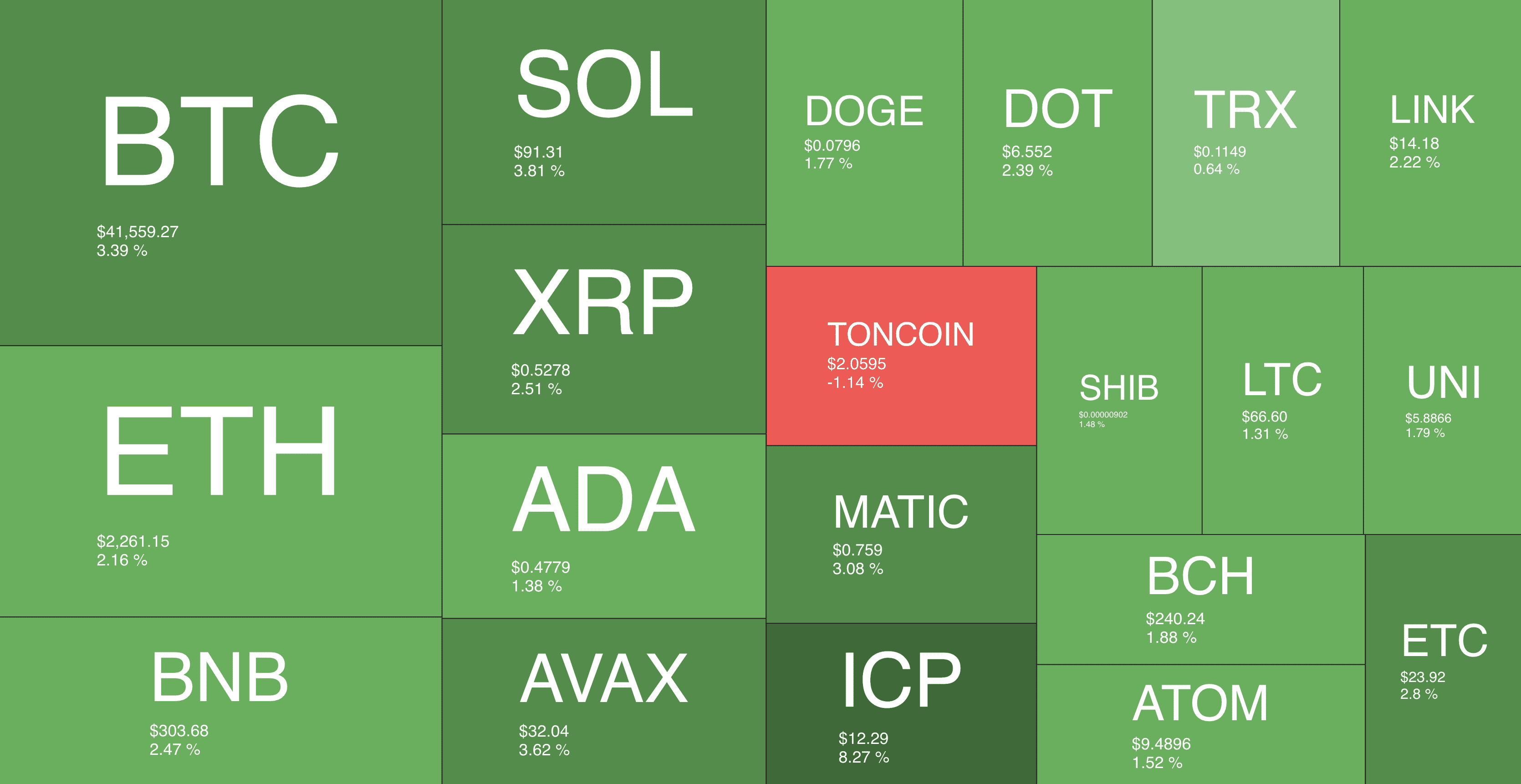 In fact, as you can see in the heatmap above, with the exception of Toncoin (TON), every other major altcoin is trading in the green.
