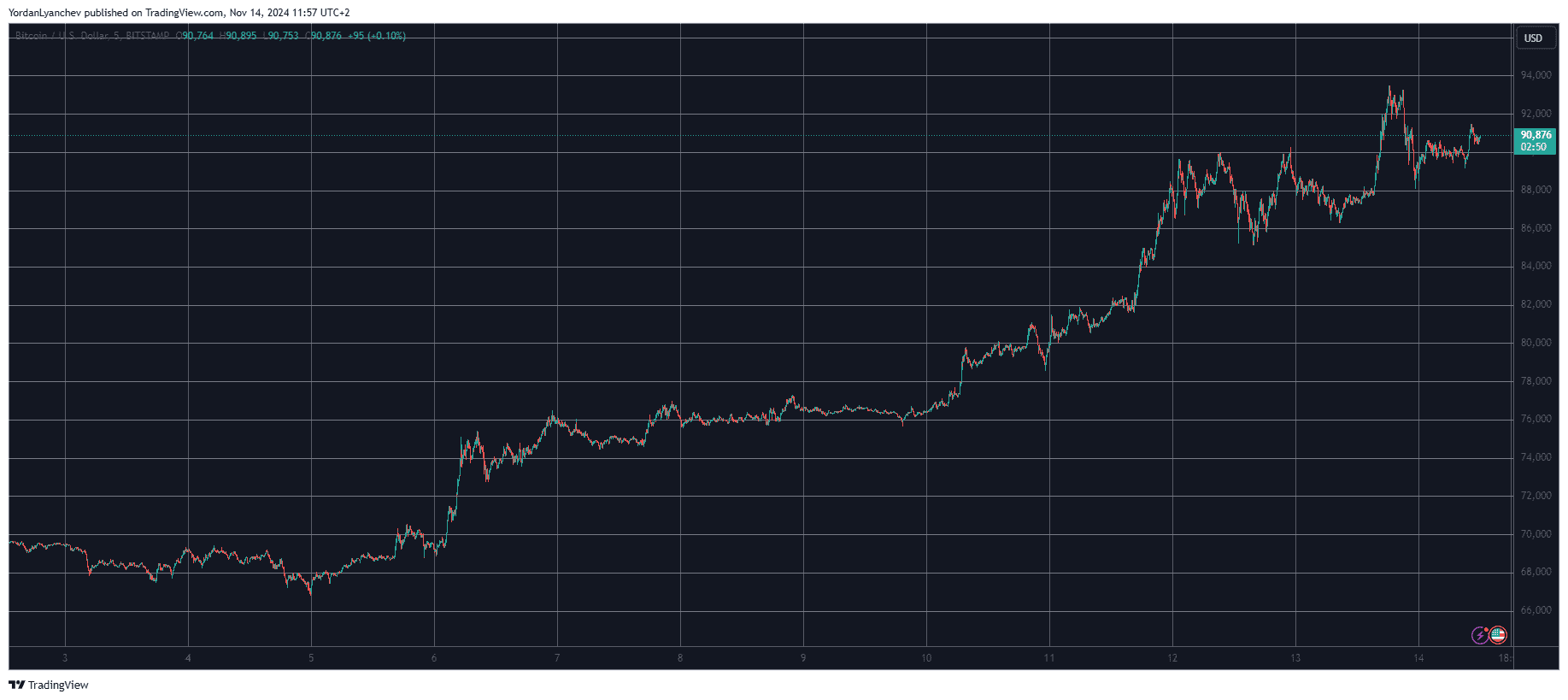 The latest peak came last night. BTC was rejected at $90,000 on a couple of occasions earlier this week but managed to break through that level yesterday, and the bulls pushed it all the way up to $93,850.
