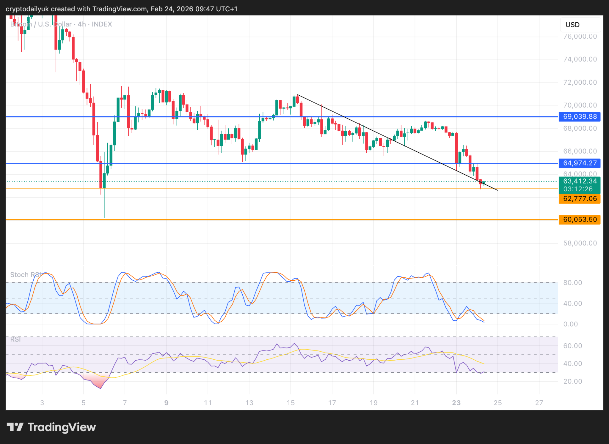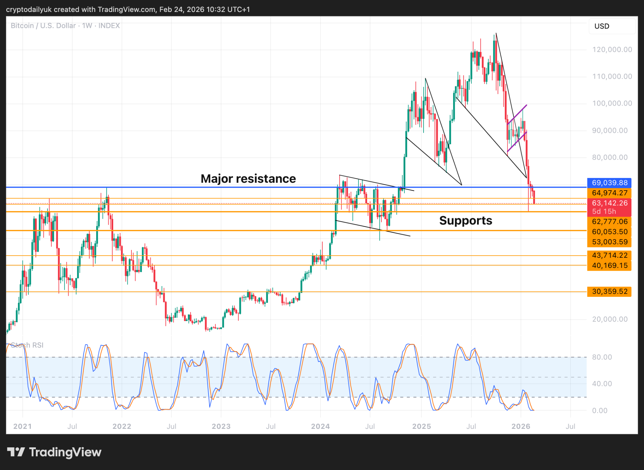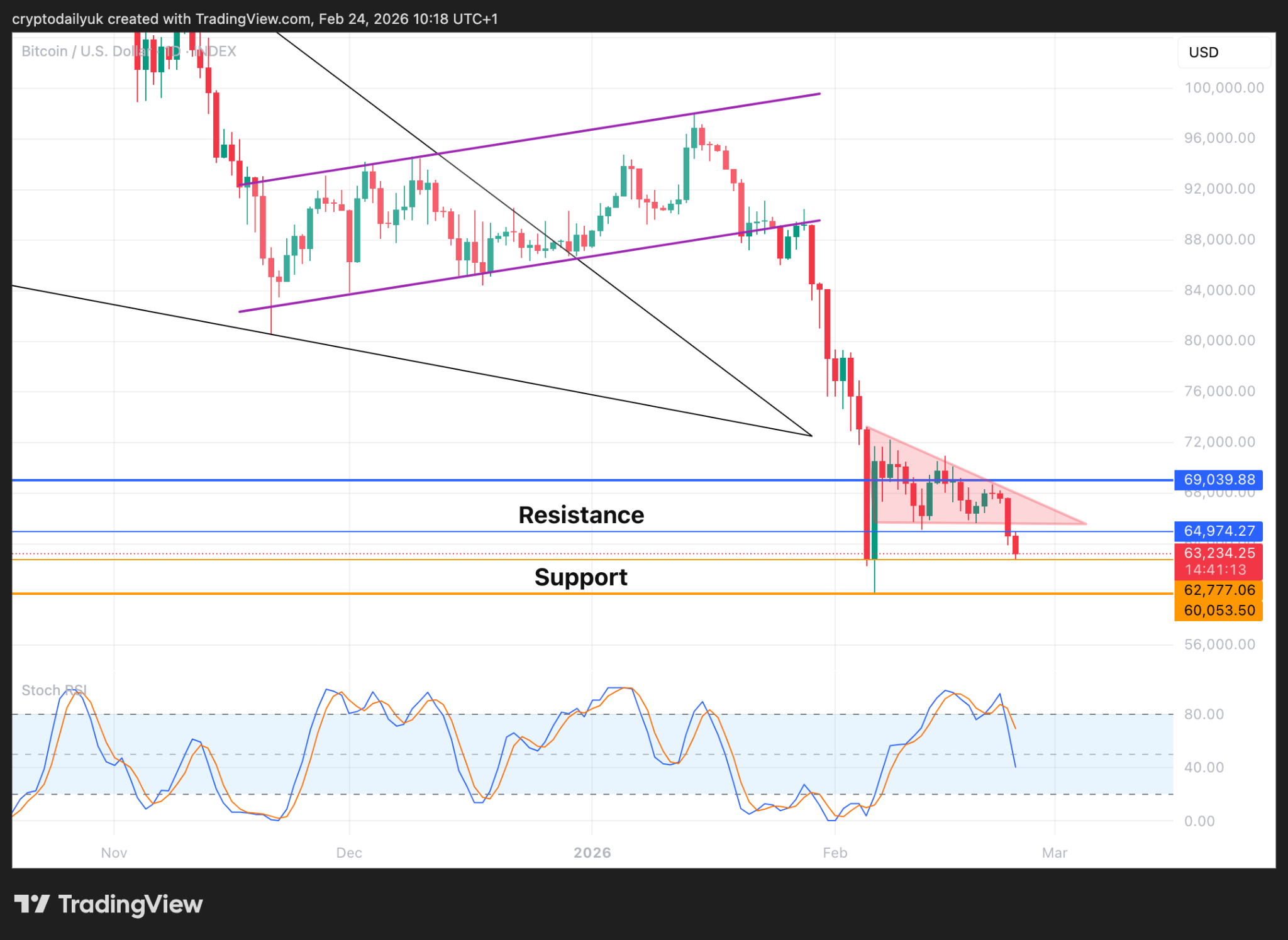 Bitcoin briefly fell under $63,000 early on Tuesday following another corrective leg down that lopped off 8.6% from the price. With the local low at around $60,200, the $BTC price is not far from a cliff edge that leads all the way down to $53,000. Will Bitcoin go over?