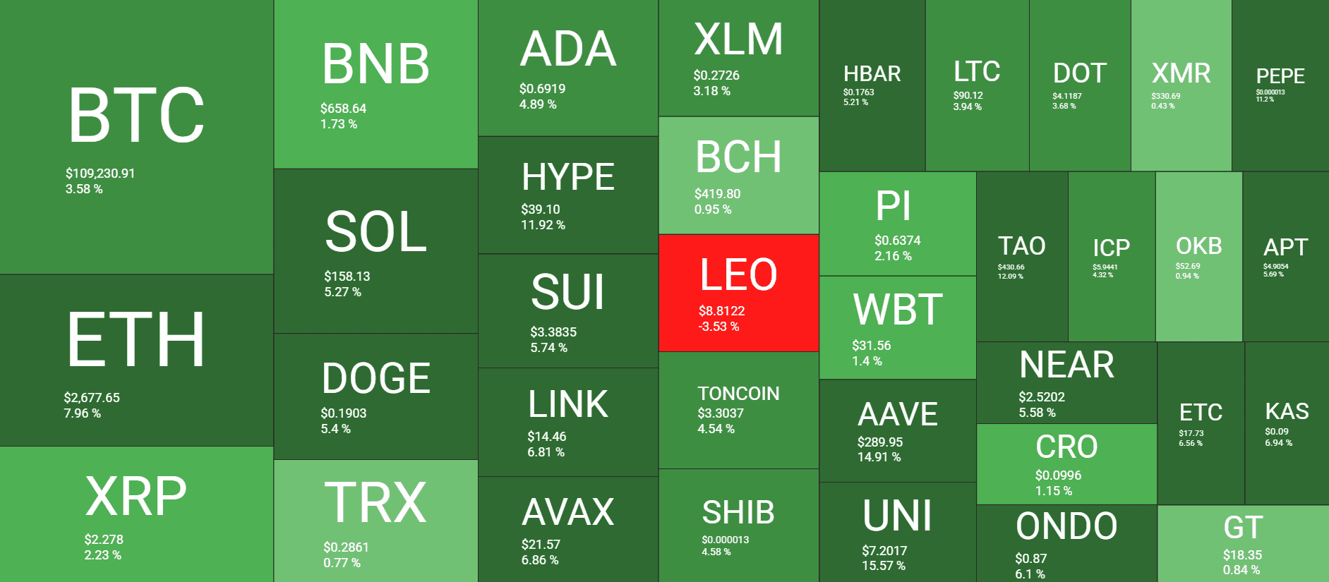Next in line from this cohort of assets are LINK, SUI, AVAX, SOL, and DOGE. Ethereum has also notched an impressive surge, gaining almost 8% and trading close to $2,800.