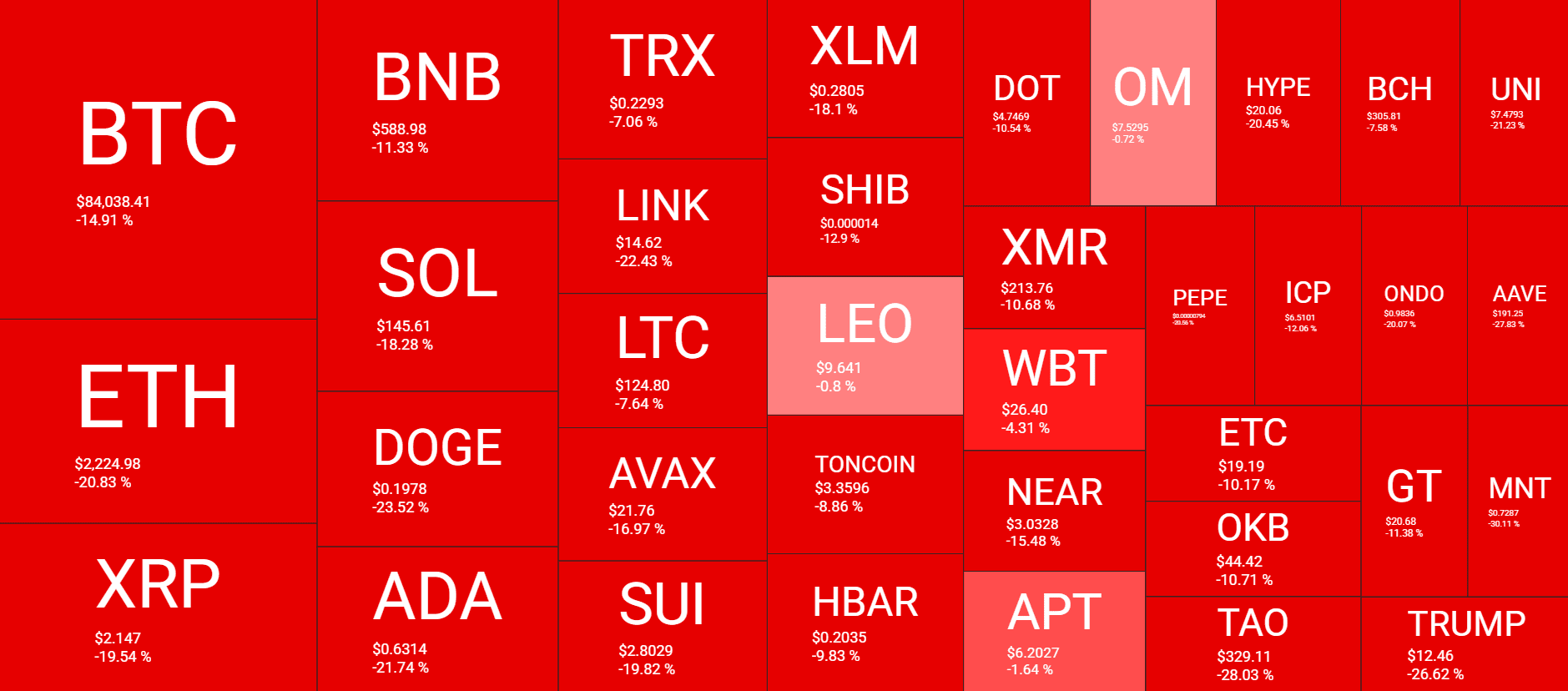 BTC: $84,131 (-15.2%) | ETH: $2,224 (-21%) | XRP: $2.15 (-19.5%)