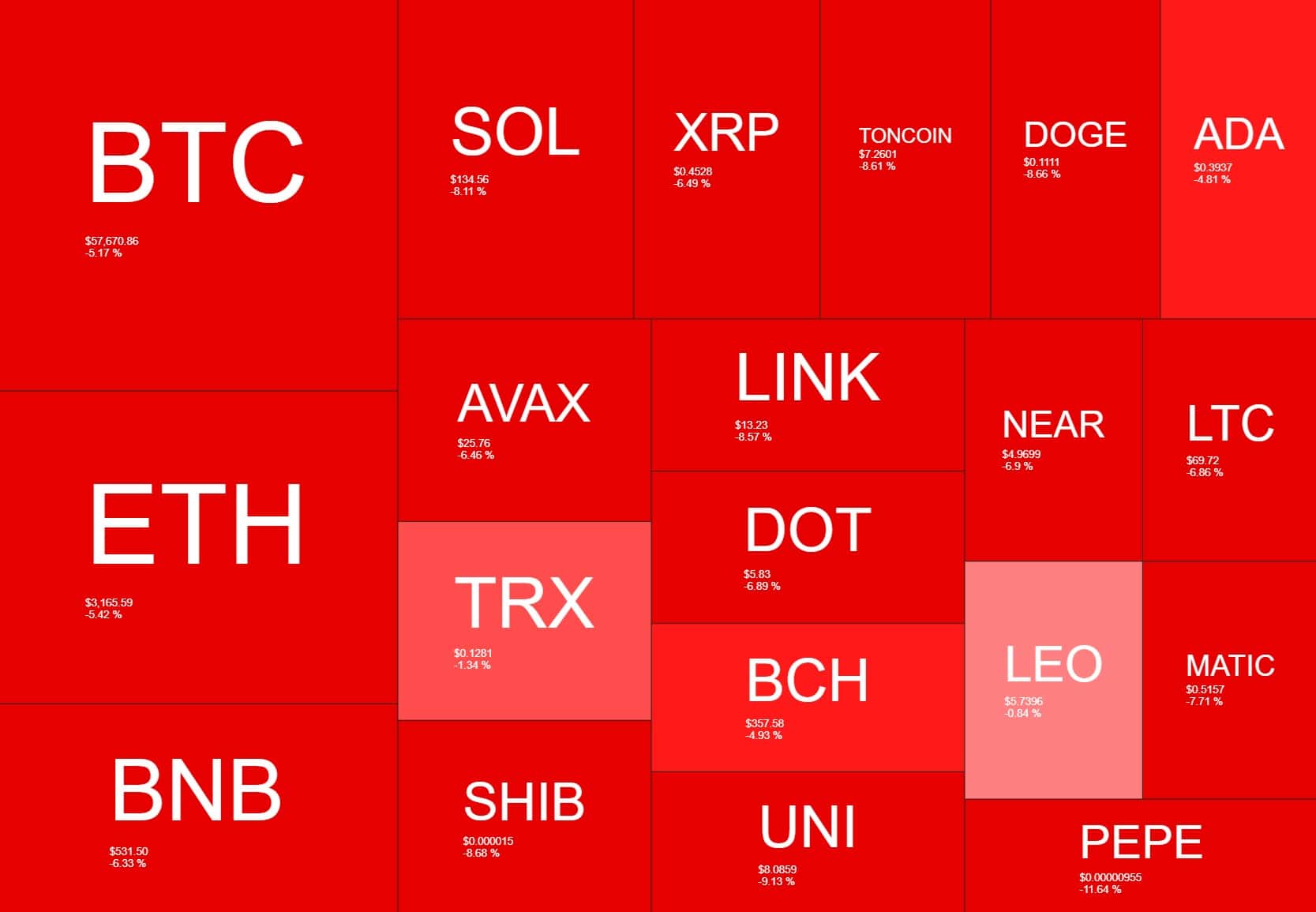 The cryptocurrency heatmap is entirely painted in red and there are absolutely no exceptions for the past 24 hours.