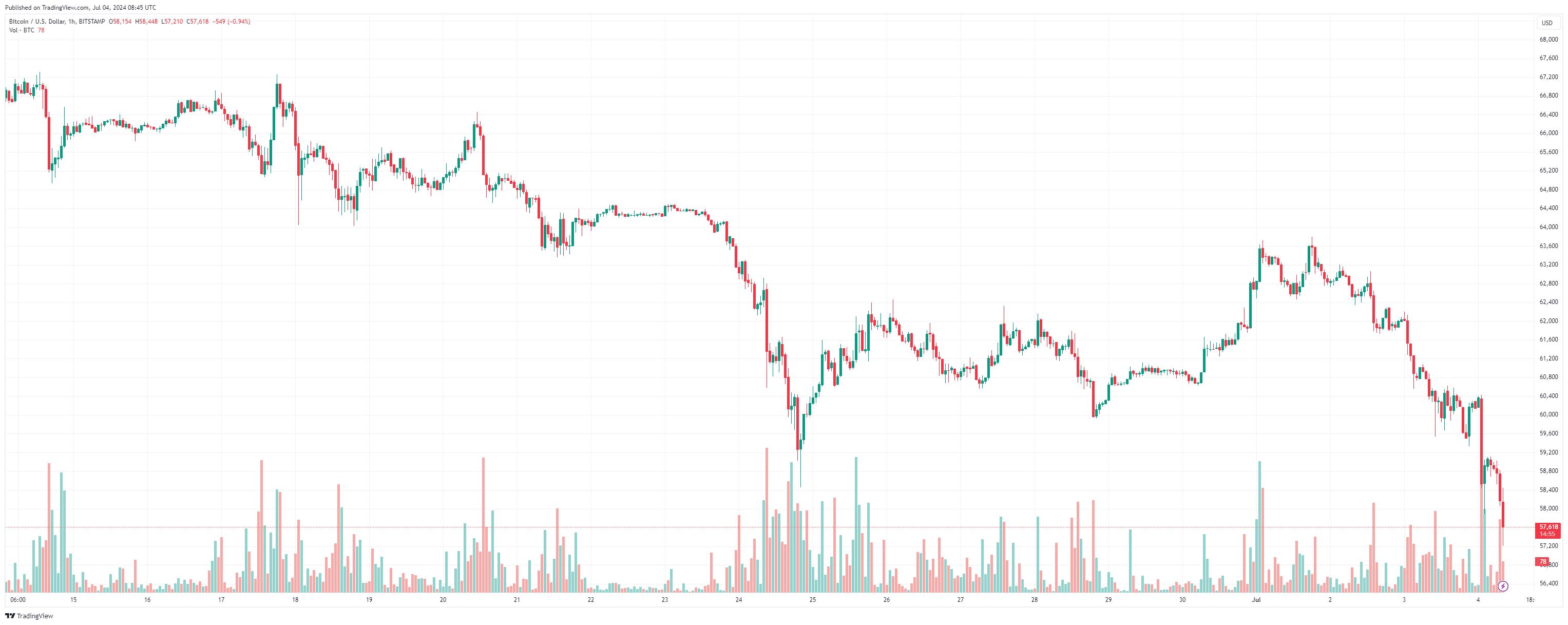At the time of this writing, Bitcoin’s price is trading at around $57,700, down more than 5% over the past 24 hours and pretty much the same for the week.