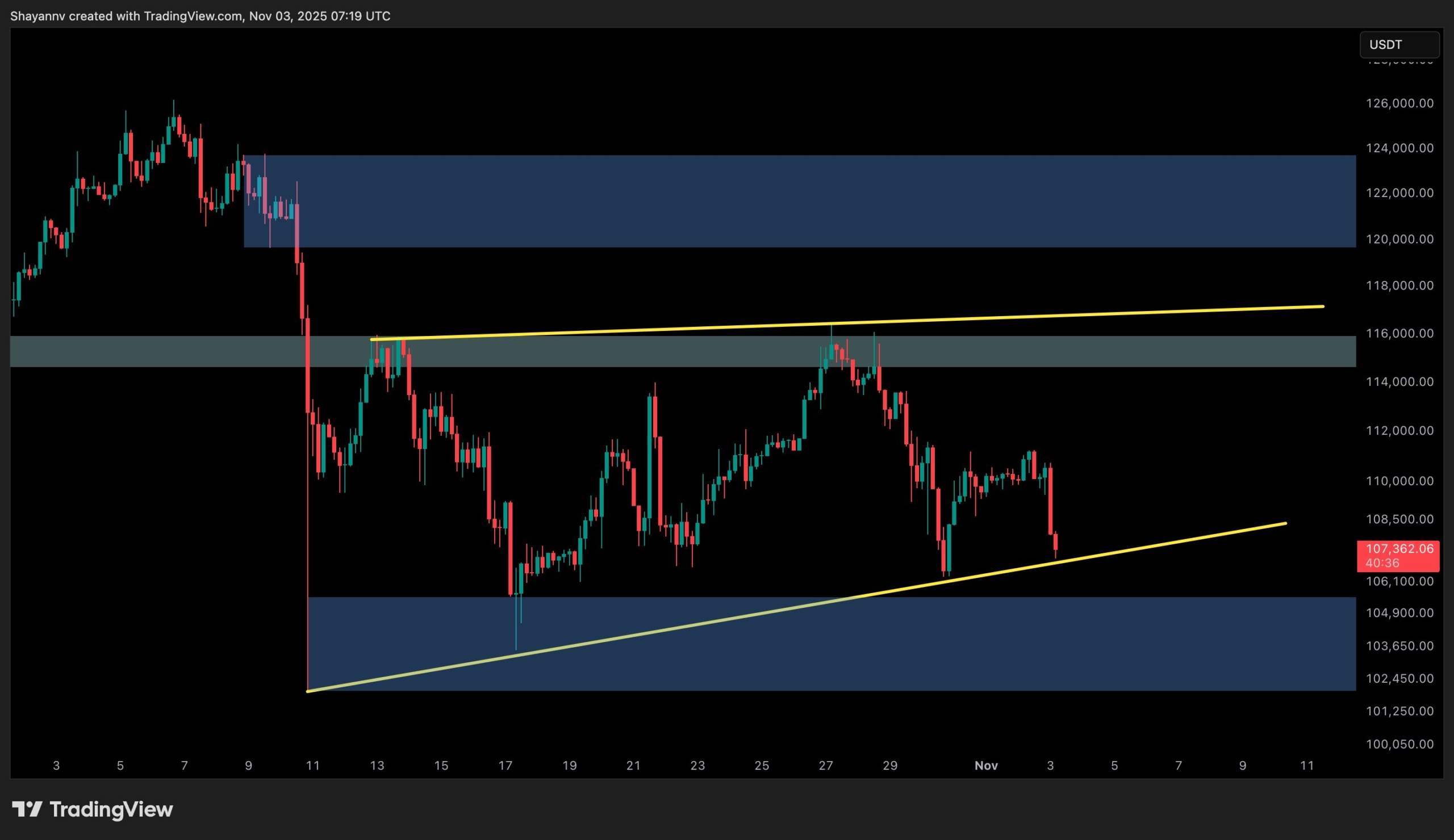 The market has repeatedly rebounded from the $103K–$108K demand zone, suggesting that buyers are still active at these levels. Yet, the series of lower highs below $116K indicates ongoing pressure from the supply zone, keeping the price locked in an equilibrium range between $105K and $116K.