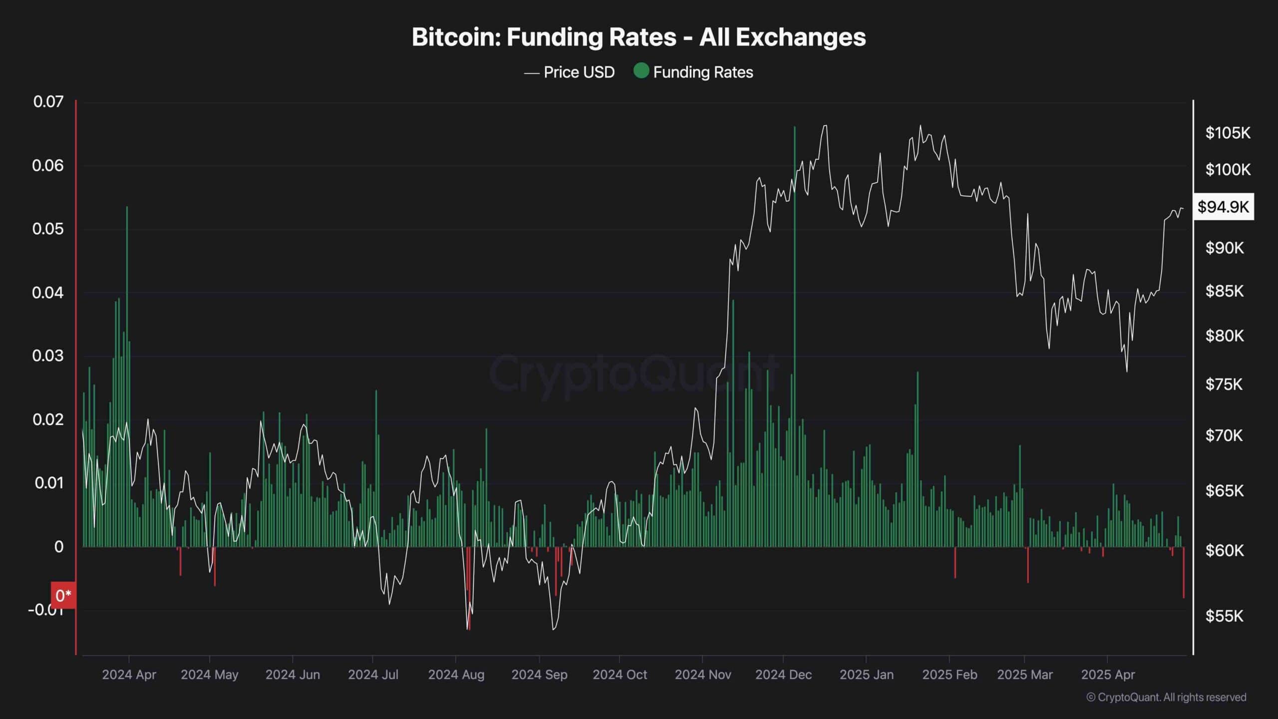 Now, a strikingly similar pattern is emerging. As Bitcoin recently rallied and approached the critical $95K resistance zone, the funding rates once again flipped negative. This divergence between rising prices and falling funding rates suggests that a significant portion of the market is either: