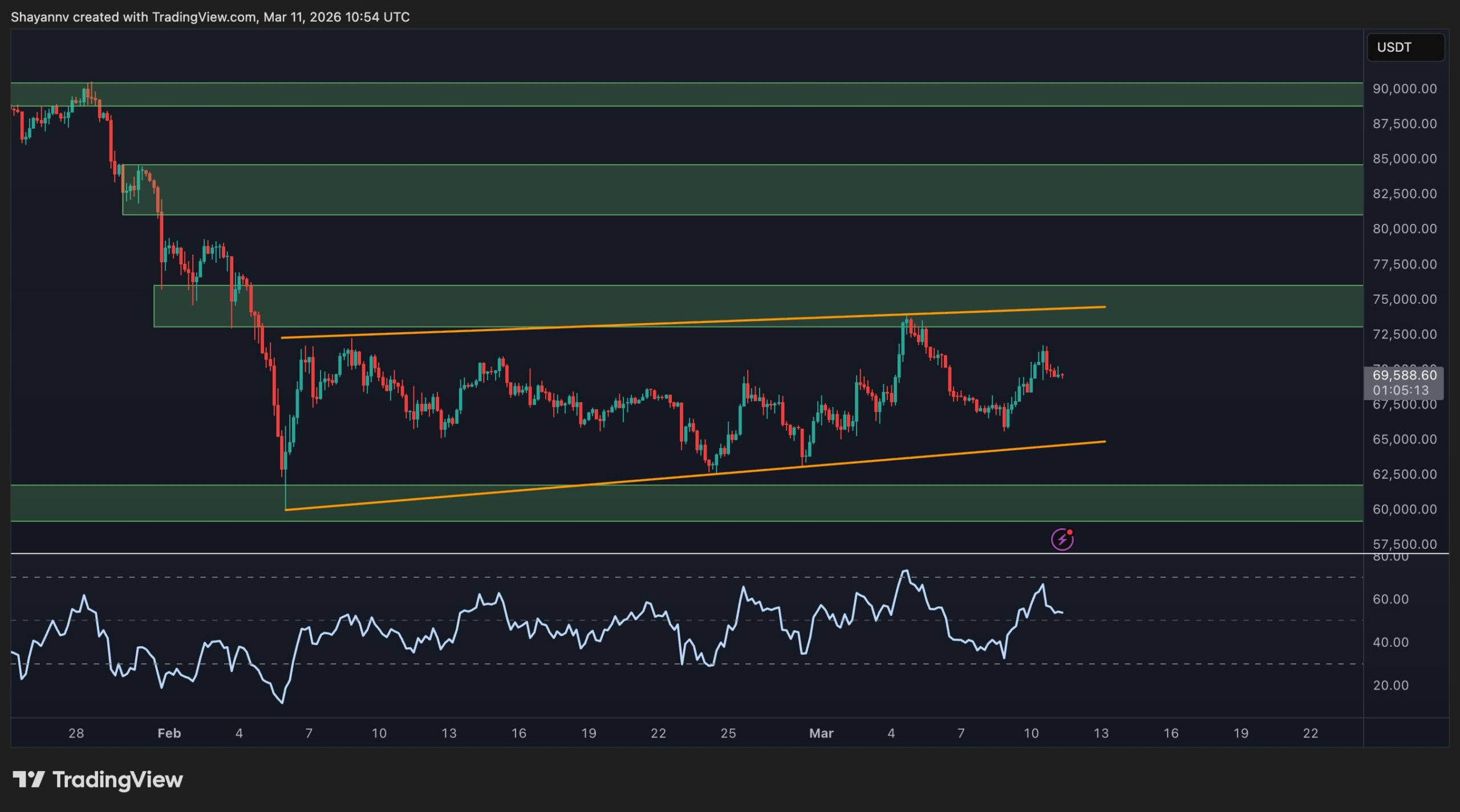 At the same time, bulls have not yet been able to break through the upper boundary of the formation, which comes in near the $73,000 to $75,000 area and overlaps with a broader resistance zone. The RSI has also recovered toward the upper half of its range, showing improving momentum, but not yet a breakout condition. That leaves the short-term picture constructive, but still dependent on a confirmed move above channel resistance.