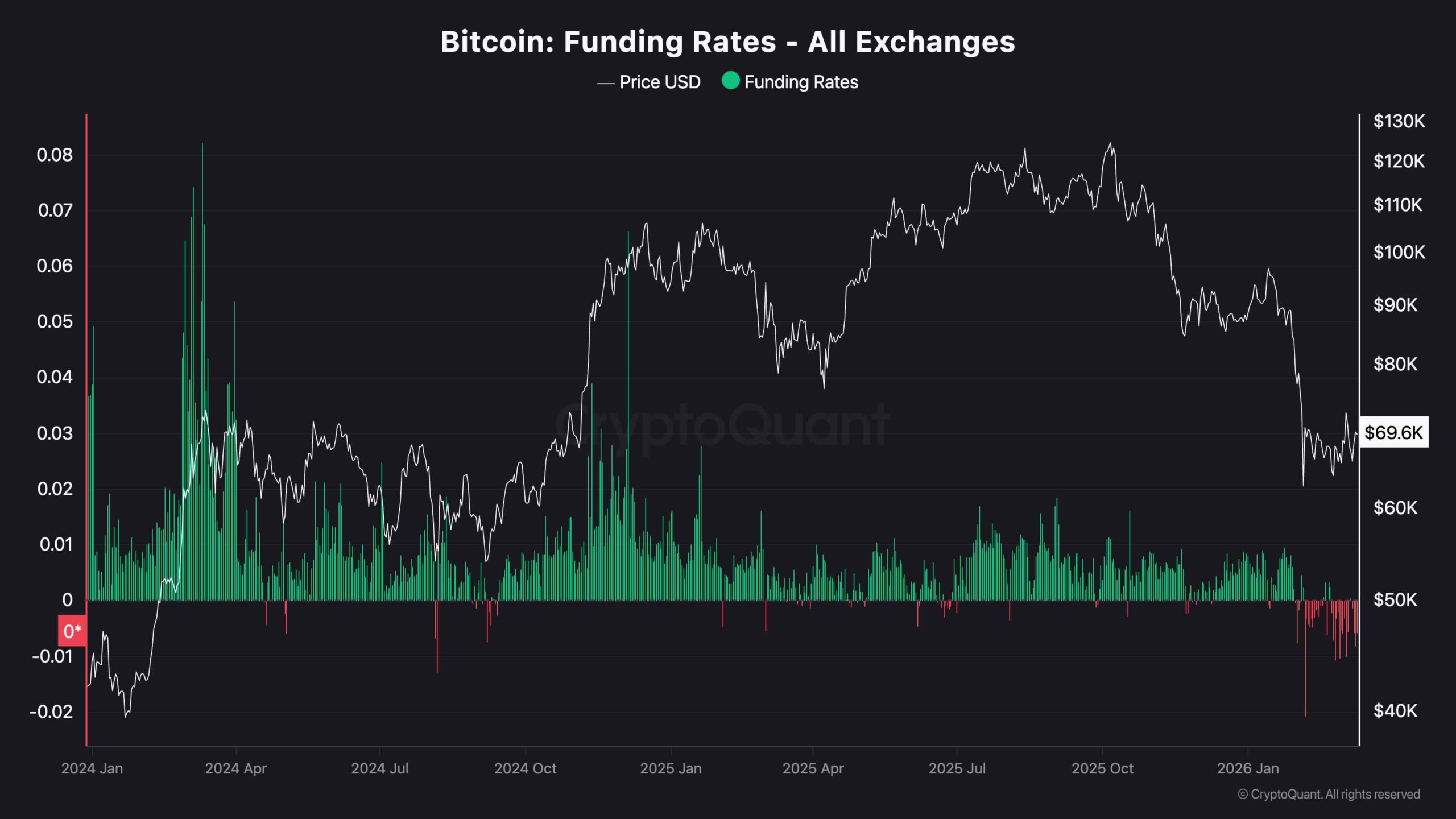 From a sentiment perspective, funding rates have turned negative again after spending most of last year in positive territory. This suggests that derivatives traders have become more cautious and negative and that short positioning has started to increase, even while the price attempts to stabilize above the recent lows.