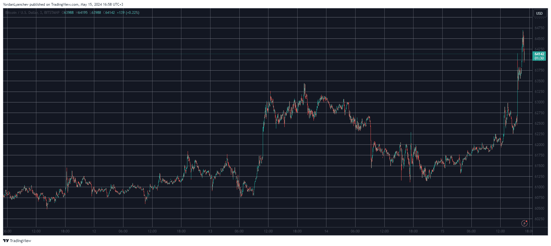 BTC’s price reacted with an immediate rally after the announcement of the April inflation rate and jumped to $64,000. However, it kept pumping in the following hour or so and tapped a multi-day peak of just over $64,500 before retracing by around $500.