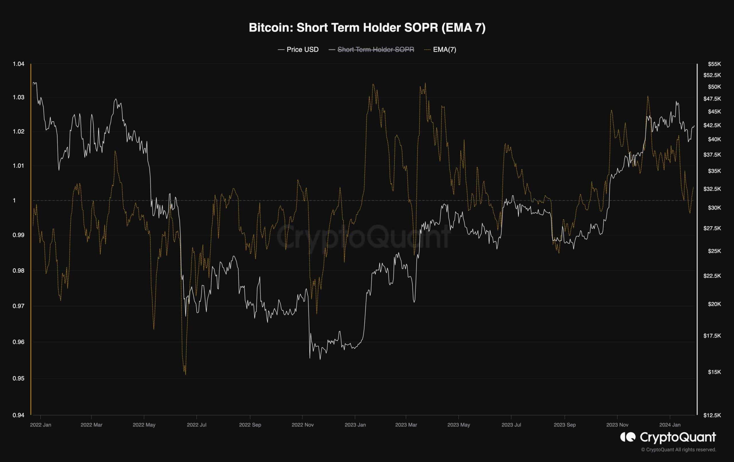 A key metric under scrutiny is the Short-Term Holder Spent Output Ratio, illustrated in the chart, with a 7-day exponential moving average applied for enhanced visualization. This metric assesses whether short-term holders—investors who acquired their coins in the past 6 months—are collectively selling at a profit or loss.
