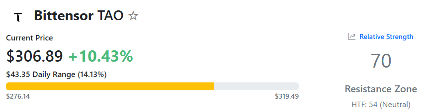 It ranges from 0 to 100, with readings above 70 signaling that the valuation has increased too much in a short period, suggesting it might be due for correction. Conversely, ratios below 30 reflect oversold conditions and a potential rebound. Currently, TAO’s RSI stands at approximately 70.
