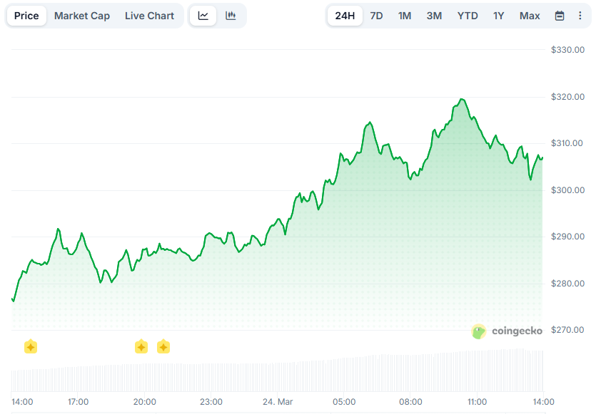 Earlier on March 24, the cryptocurrency’s price pumped to almost $320, the highest point in the past four months. It later lost some steam and currently trades at around $310, representing a 10% daily increase.