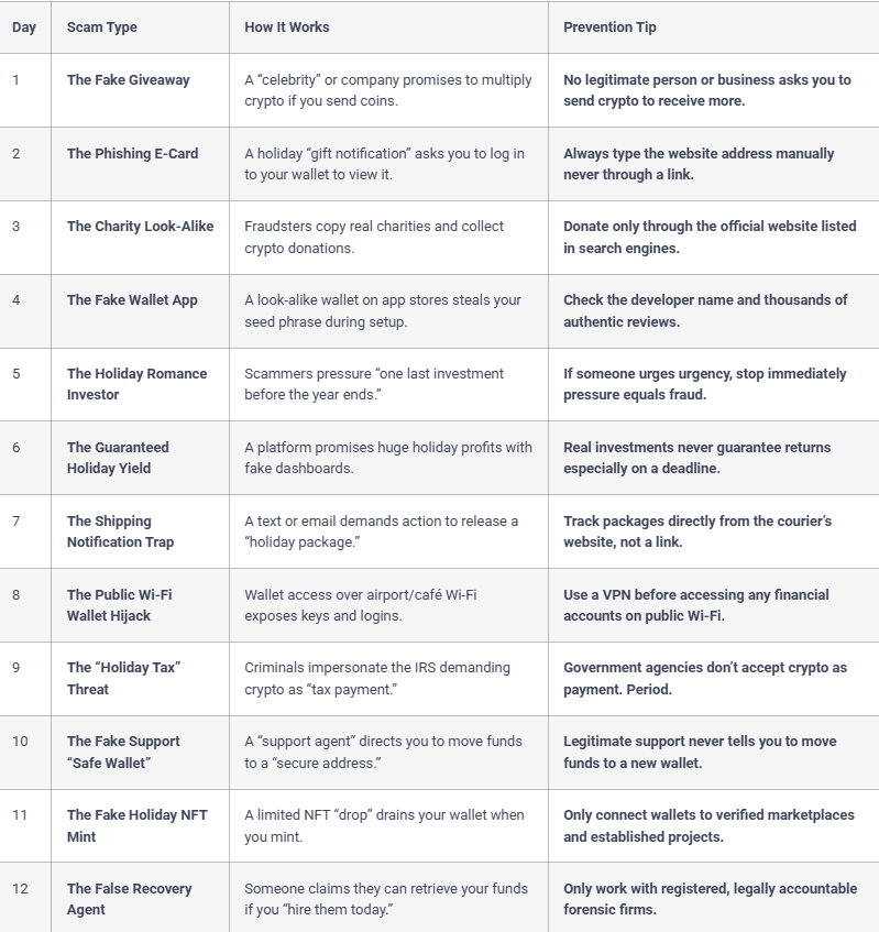 Lionsgate developed a “12 Scams of Christmas” checklist that offers a practical way to navigate these threats. It highlights tactics such as fake charity pages, lookalike wallet apps, fraudulent investment pitches, and limited-time NFT mints, all designed to drain wallets.