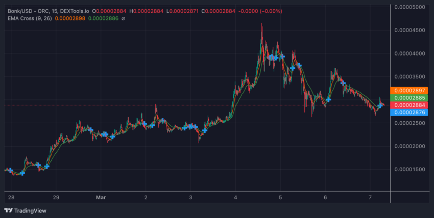 BONK price and EMA Cross (9, 26). Source: DexTools.