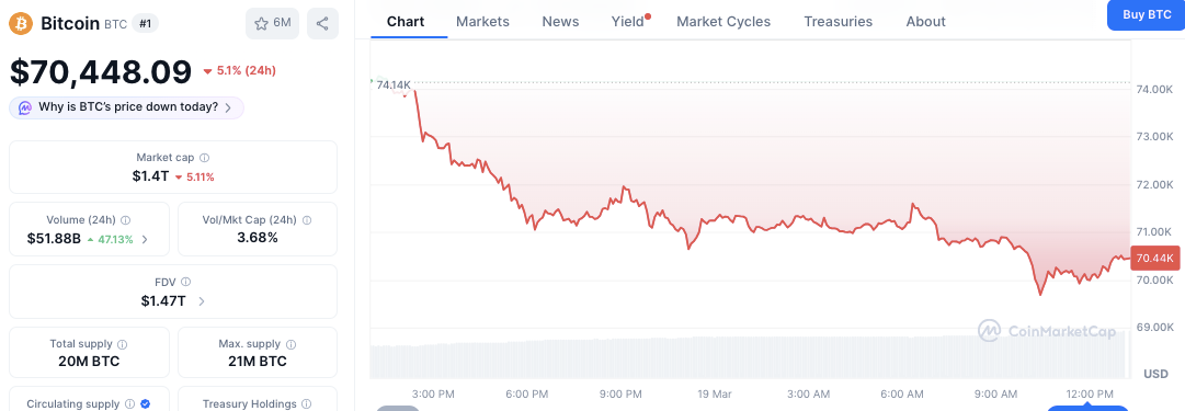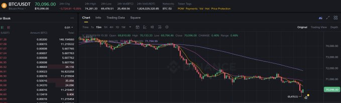 Binance market data showed Bitcoin falling below $70,000 in the latest session, last trading at $70,096, down 5.18% over 24 hours, after touching an intraday low of $69,478.51. In addition, CoinGlass data showed $61.71 million in liquidations over one hour, including $59.76 million in long positions and $1.95 million in shorts.
