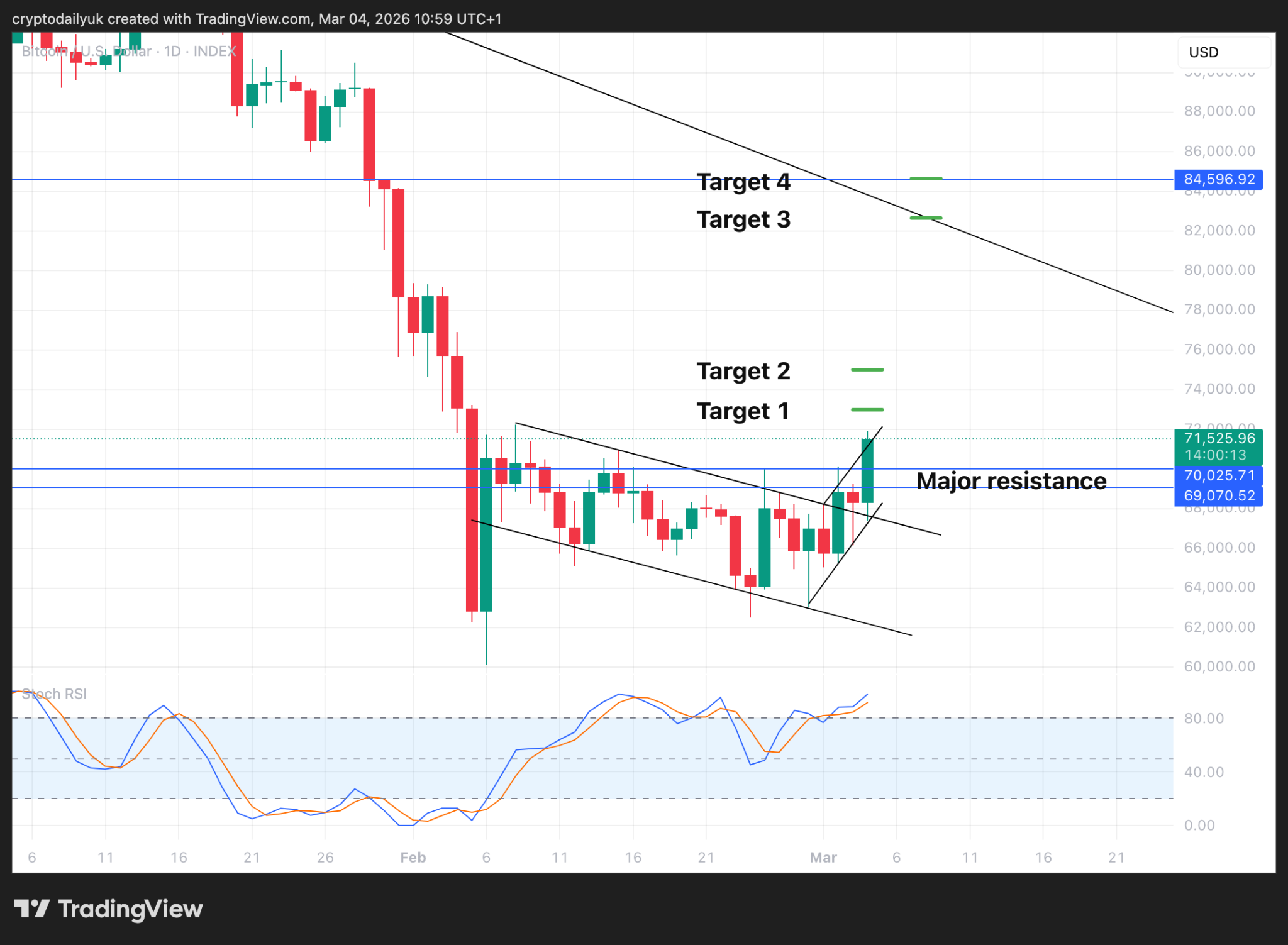 Price action is moving fast early on Wednesday. $BTC shot out of the blocks after breaking out of a month-long descending channel and coming back to confirm the breakout. This time, instead of another fakeout, the $BTC price shot up in the space of a few hours, taking out the major $69K and also the $70K resistances in quick succession.