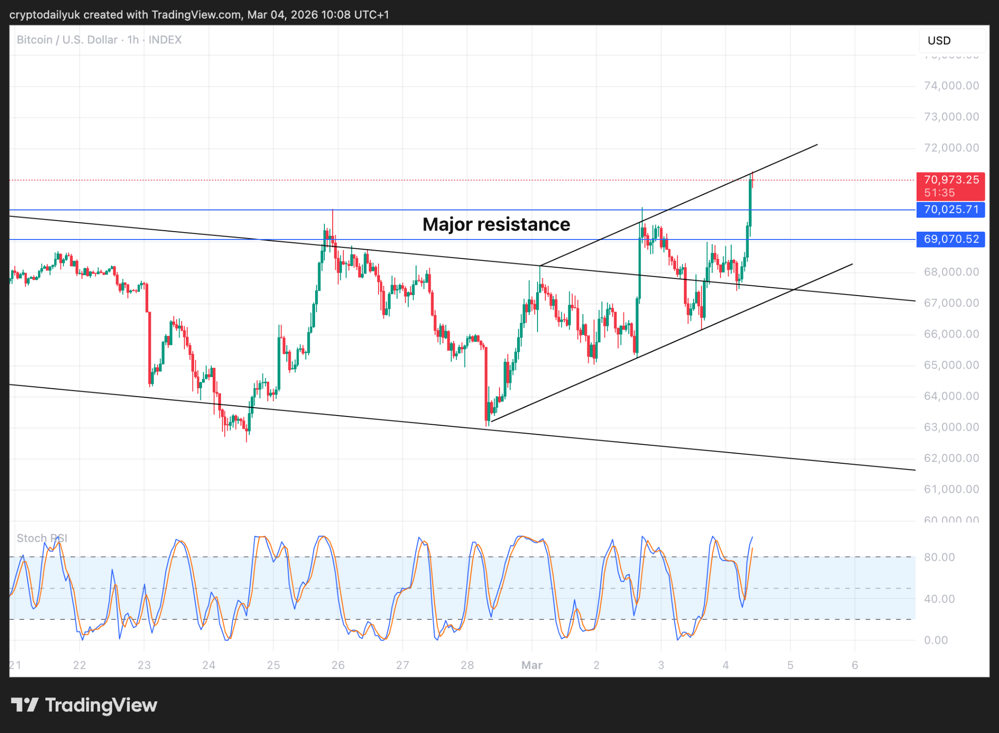 The Bitcoin price is currently rallying strongly and after breaking out of a month-long channel, it has just touched $71,000, a good way above the major resistance level of $69,000. Is this just market manipulation, or could this be a legitimate rally?