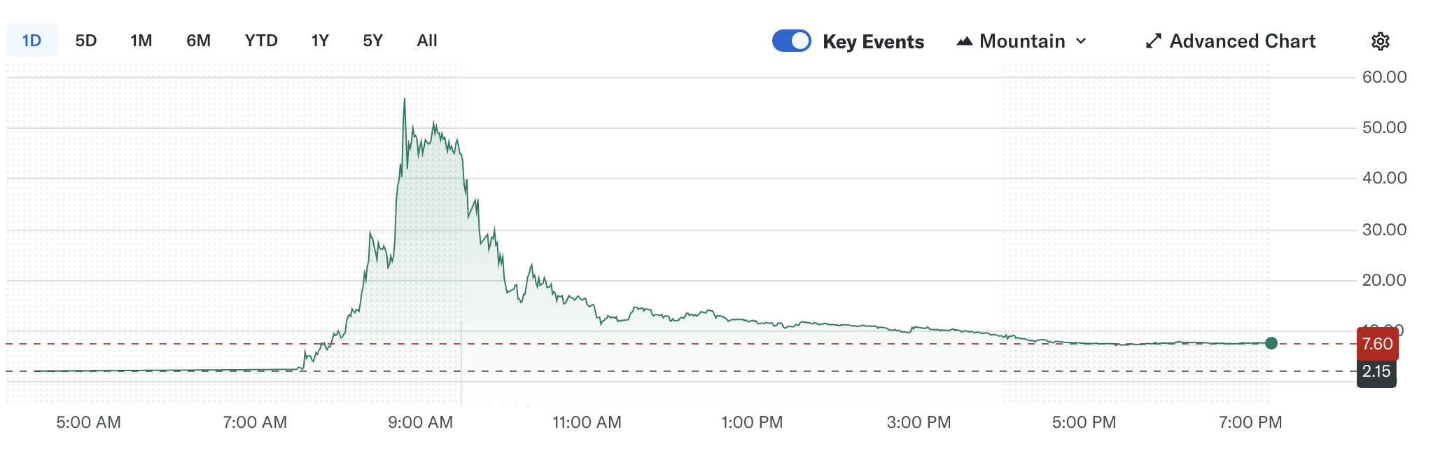 CWD stock erupted on the announcement, with more than 79 million shares traded versus a typical daily average of under 10 million. Its shares—previously trading near $2.10—surged more than 2,500% intraday to a peak of $56 before settling at $7.60 by the close.