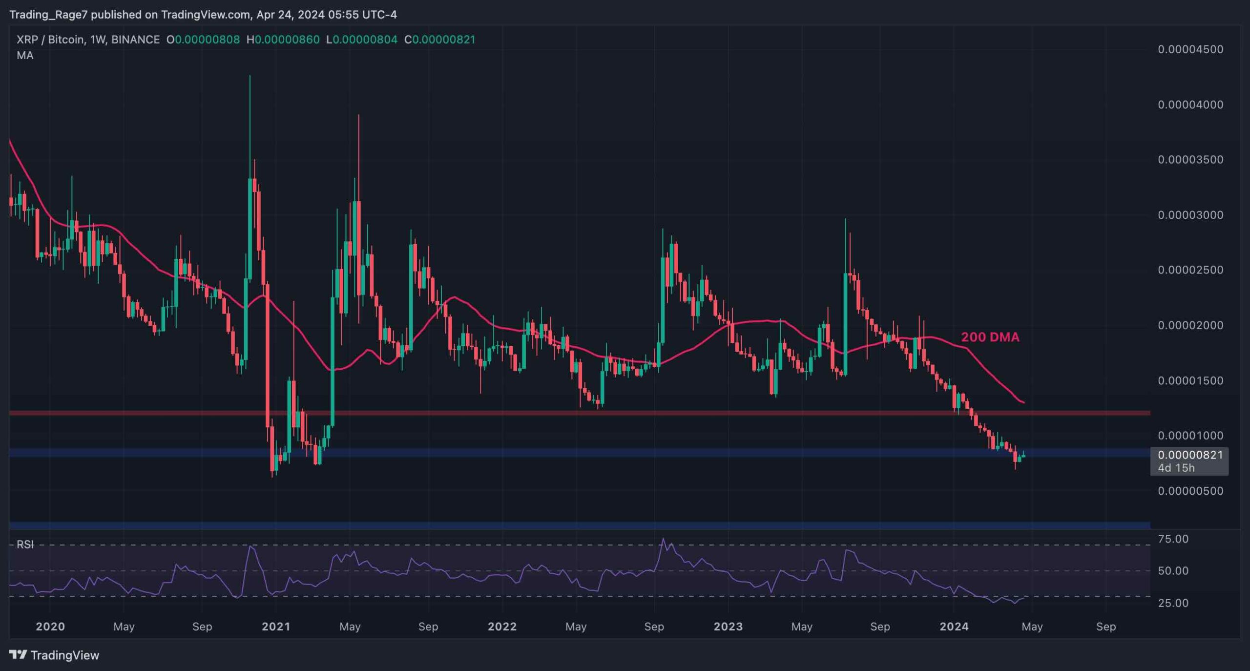 The Bitcoin pair’s weekly chart shows that the price has been consistently trending down since dropping below the 200-day moving average. It is currently testing the 600 SAT support level. If the level breaks down, it would be catastrophic as XRP can experience a much deeper decline in the upcoming months.