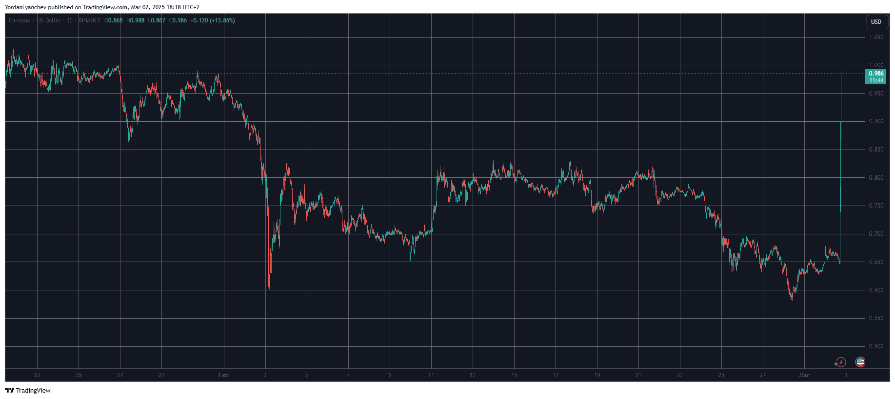 - Cardano’s native token is riding the Trump-induced wave like no other, with a massive price surge that pushed it from $0.65 to almost $1 within minutes.