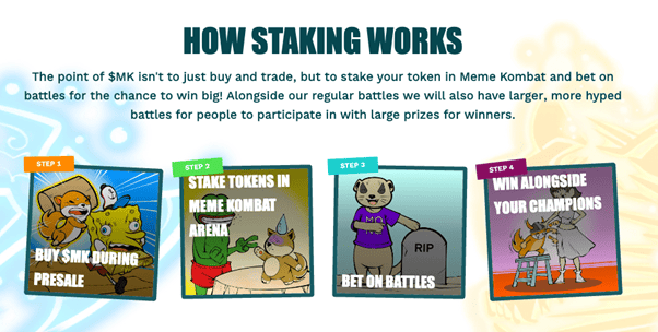 In the Meme Kombat ecosystem, users can bet on meme token battles, stake their MK holdings to earn rewards and participate in a vibrant online community.