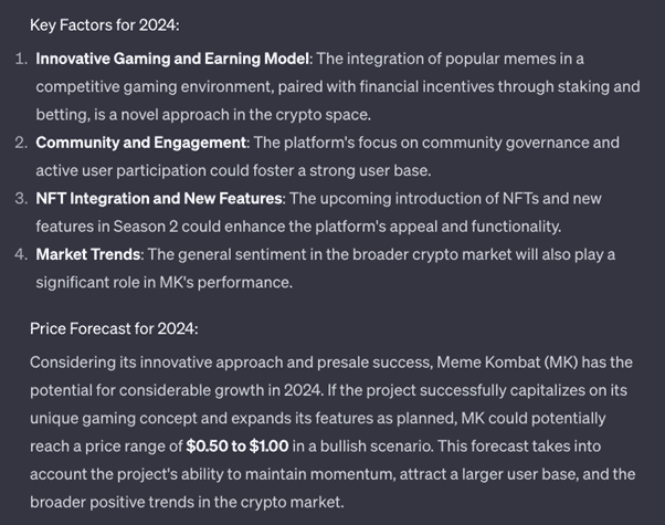 ChatGPT is particularly bullish on MK’s prospects thanks to its unique blend of entertainment and crypto-earning potential.