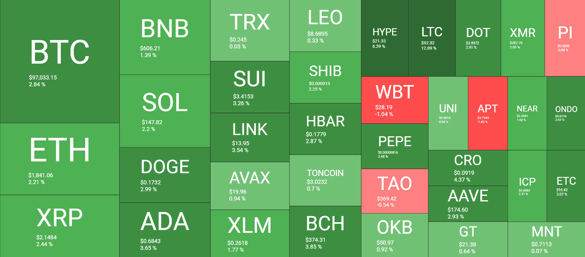 HYPE follows suit in terms of daily gains, having surged past $21 after a 6% increase. CRO, AAVE, SUI, LINK, DOGE, ADA, BCH, and HBAR are also well in the green.