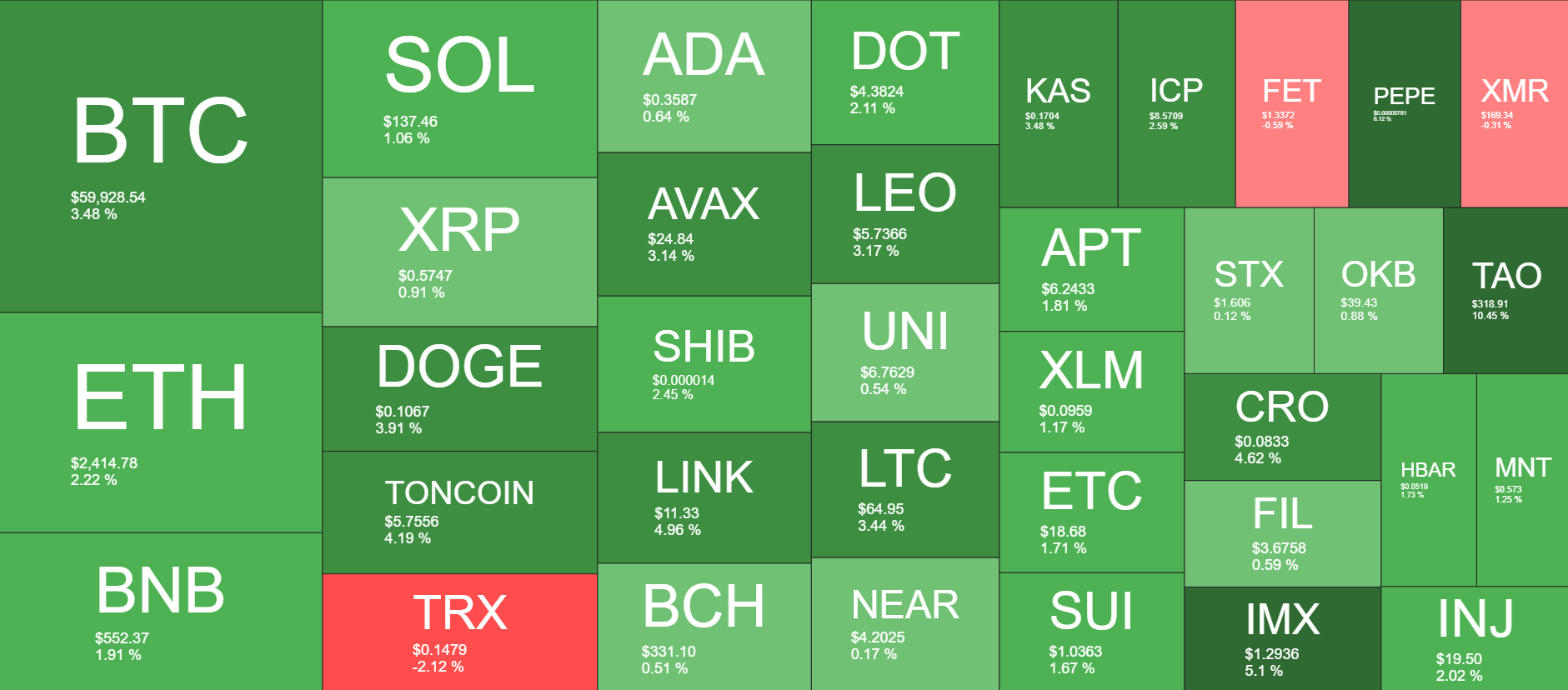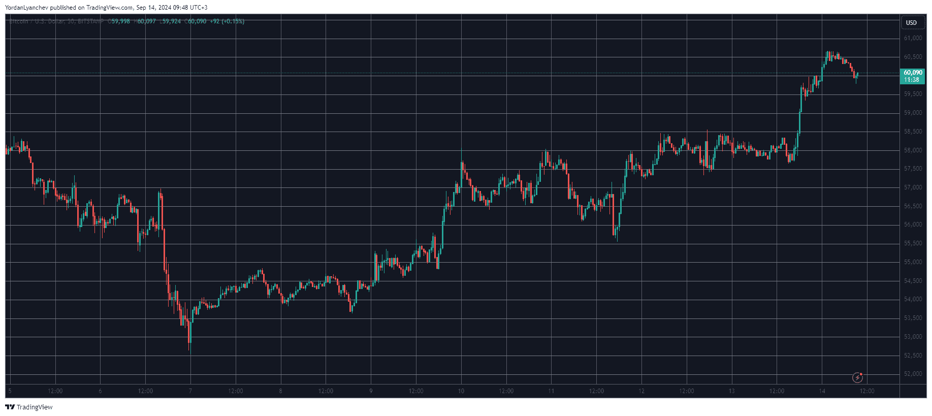 However, the bulls seemed to have taken control of the market. They initiated another leg up on Friday that resulted in BTC nearing $60,000. Although it failed at first, the cryptocurrency flew past that level earlier this morning and tapped a 16-day peak of just over $60,500.