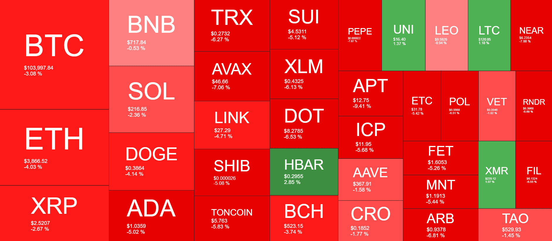 More losses come from the likes of ADA, TRX, AVAX, SHIB, TON, SUI, XLM, DOT, and APT, with price drops of up to 9%. PEPE has also dropped hard, currently struggling to remain above $0.0000215.