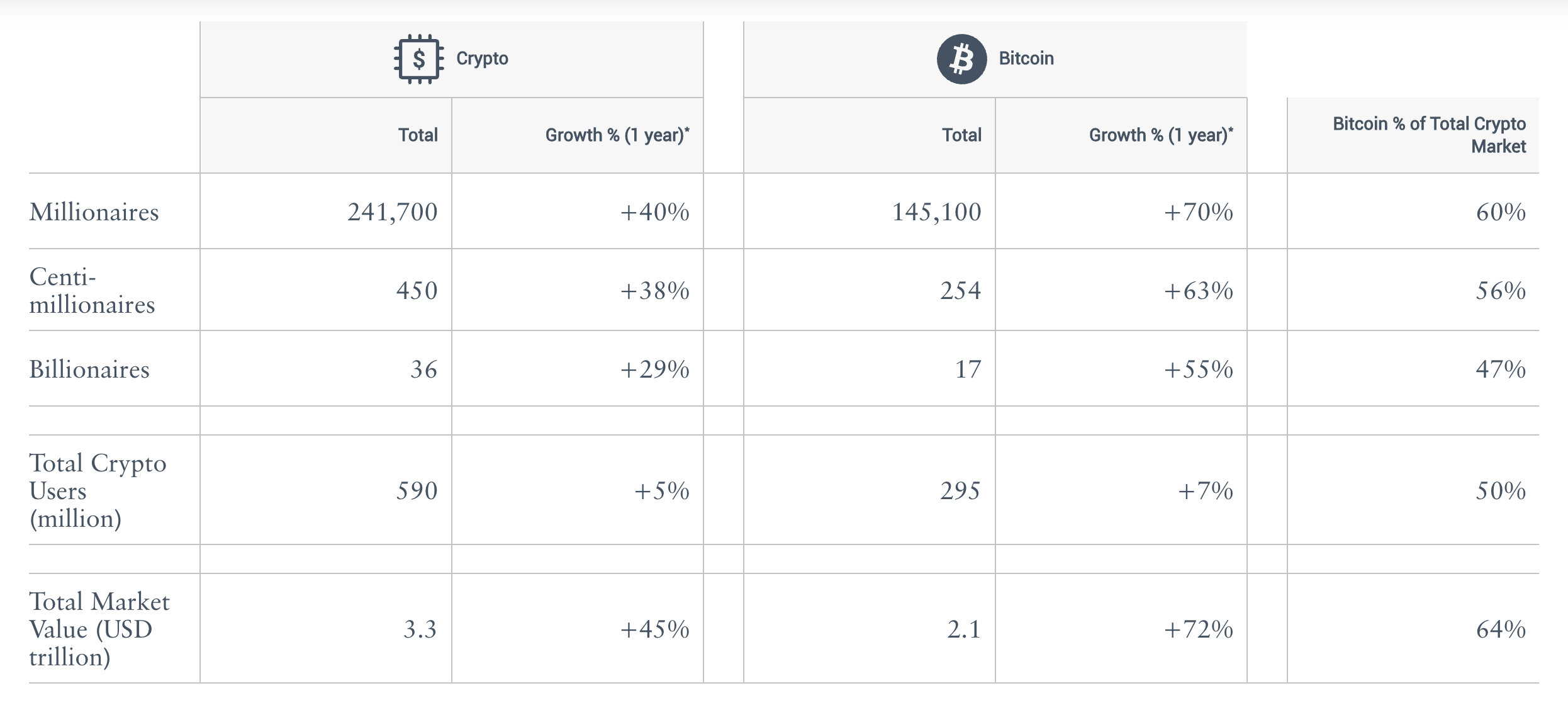 These numbers are small in the broader context: UBS’s latest Global Wealth Report estimates there are 60 million millionaires worldwide, meaning crypto millionaires represent only 0.4%.