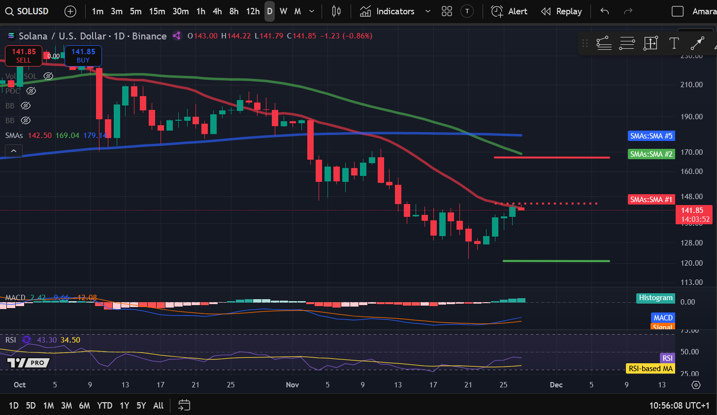 SOL reached an intraday high of $144 on Thursday but lost momentum after reaching this level. As a result, it fell 2.48% to $133. Selling pressure intensified on Friday with SOL falling to an intraday low of $121. However, it rebounded from this level and settled at $128, ultimately dropping 3.69%. Price action was mixed over the weekend, with SOL falling 0.83% on Saturday before rising 2.36% on Sunday and settling at $130. Bullish sentiment intensified on Monday as SOL rose over 6% and settled at $138. The price fell to an intraday low of $133 before rebounding and registering a marginal increase. SOL continued pushing higher on Wednesday, rising nearly 3% and settling at $143. SOL is marginally down during the ongoing session, trading around 141.