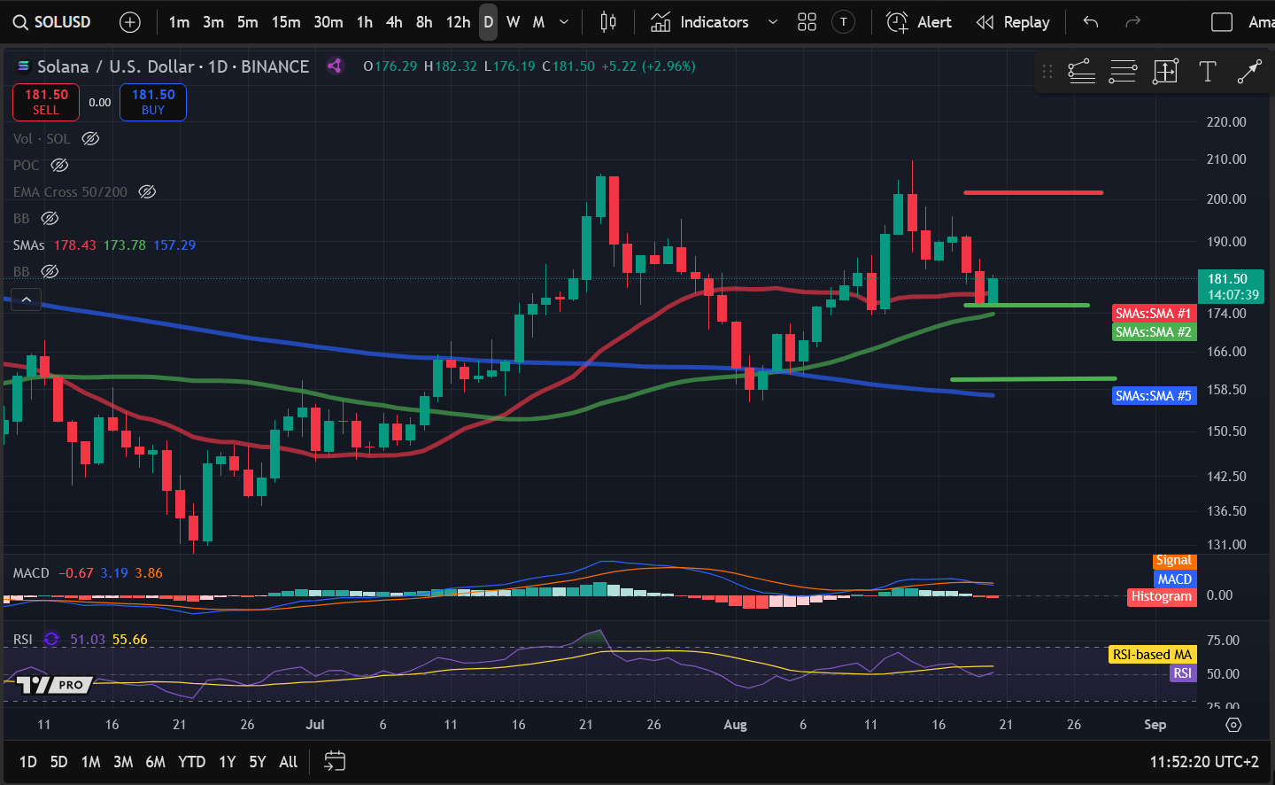SOL started the previous weekend in positive territory, rising almost 1% on Friday (August 8). Buyers retained control over the weekend as the price rose 1.80% on Saturday and 1.52% on Sunday, crossing $180 and settling at $182. Despite the positive weekend, SOL was back in the red on Monday, dropping over 4% to $174. Bullish sentiment returned on Tuesday as SOL rallied, rising nearly 10% to cross $190 and settle at $191. Bullish sentiment persisted on Wednesday as the price rose 5.04% to cross $200 and settle at $201.
