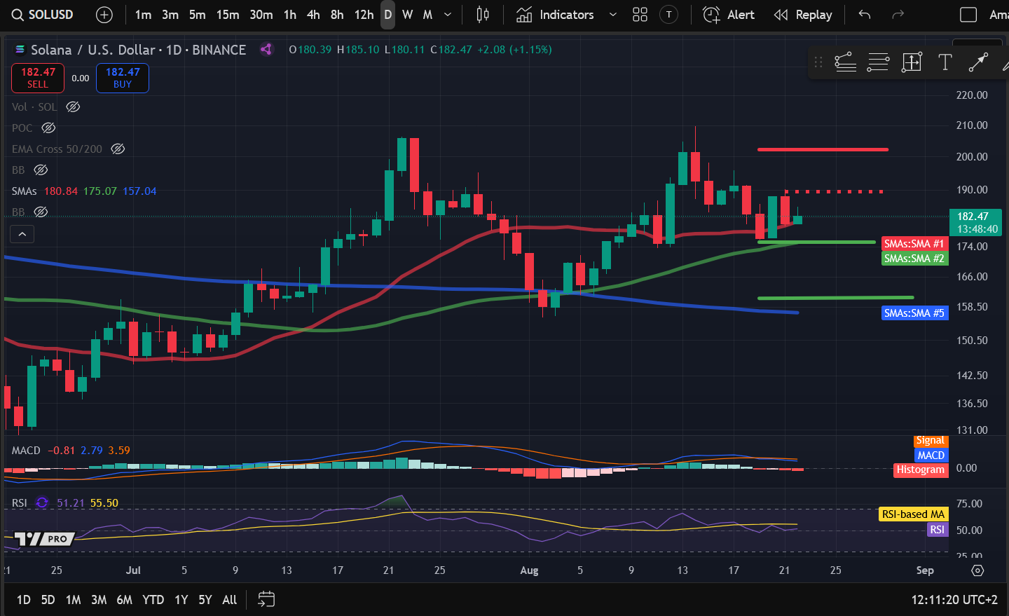 Sellers retained control on Friday as SOL fell 3.48%, slipping below $190 and settling at $185. Price action was positive over the weekend as SOL rose 2.06% on Saturday and 0.73% on Sunday to reclaim $190 and settle at $191. However, it was back in the red on Monday, dropping over 4% to $183. Sellers retained control on Tuesday as SOL fell 3.69% and settled at $176. Despite the selling pressure, it made a strong recovery on Wednesday, rising almost 7% to $188. SOL was back in the red on Thursday, dropping over 4% to $180. The current session sees SOL up 1.14%, trading around $182 after reaching an intraday high of $185.