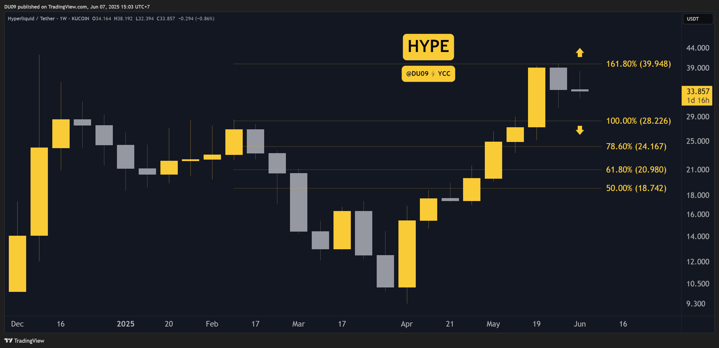 While this news was bullish in the short term, the price action seems to show the opposite. Based on the weekly candles, we can see that HYPE appears to have topped around $40 and is making lower highs since then. This could be the start of a longer consolidation or pullback around $30.