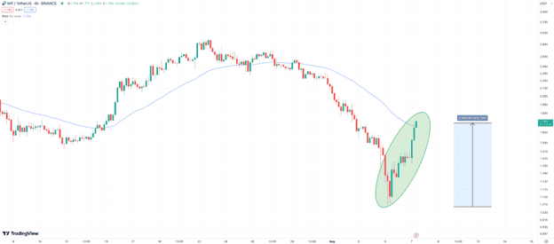 WIF is breaking through its 50-period EMA, which usually means the medium-term trend has flipped.