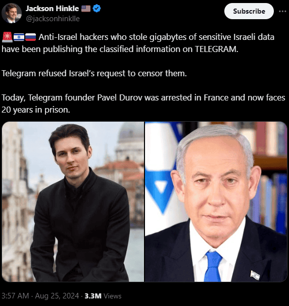 Another US political commentator, Jackson Hinkle, brought an intriguing version of why Durov might have been arrested.
